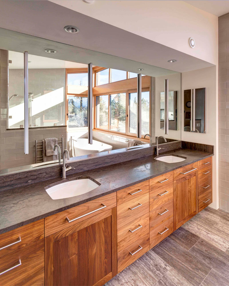 In the bathroom, a large mirror reflects the light from the window and views of the valley, while wood cabinets and a stone counter bring a natural touch to the interior.