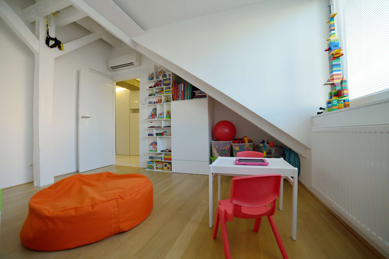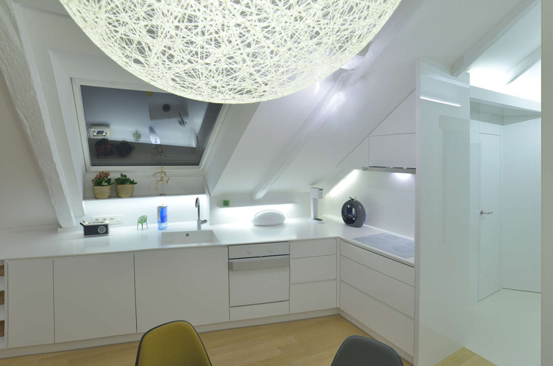 With new roof standing, the authors had an Idea, that white color will be essential element in the whole apartment, visually enlarging its spaces. And at the top of it, white color will help to unite different shapes of connected spaces throught the interior. Also to improve the cubature of space, dormers were built in several rooms.