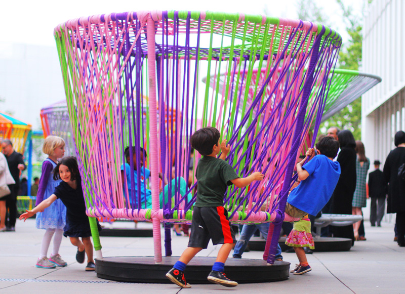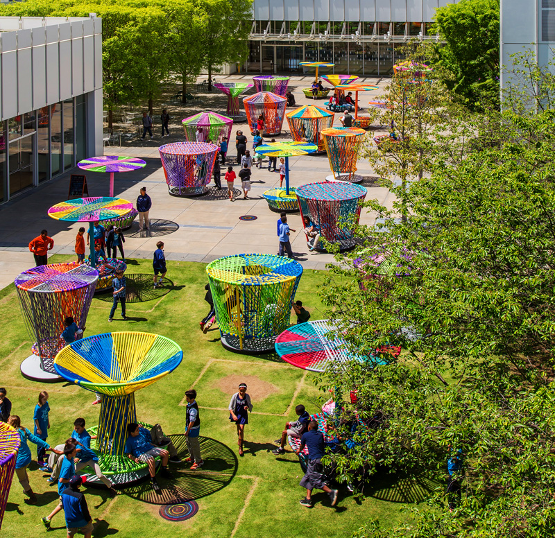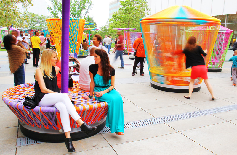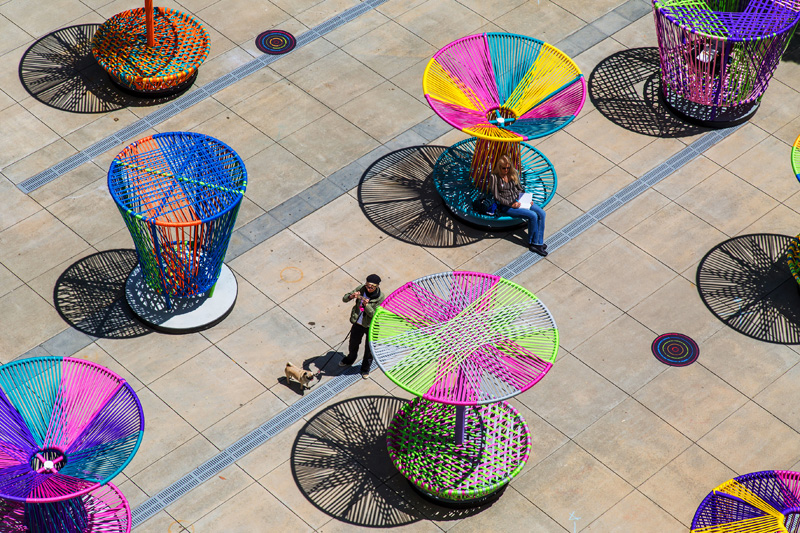 As a blank canvas for community engagement and programming, “Los Trompos” draws its inspiration from the form of a spinning top, a toy popular with children around the world. The project features more than 30 three-dimensional, larger than-life tops in a variety of colors and shapes, which are installed throughout the piazza.