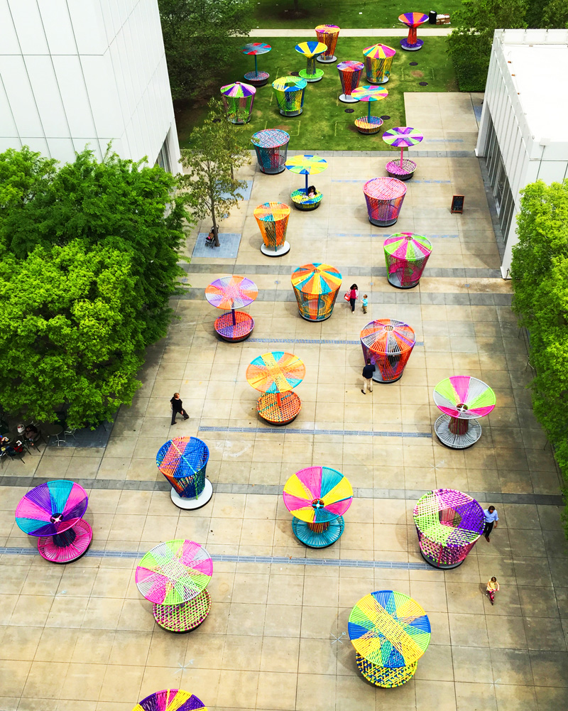 The colorful surfaces of each “top” are created in part by fabric woven in a traditional style by Mexican Artisans. By working together, visitors may spin the tops on their bases as they interact with the structures. “Only through this interaction and collaboration will the work come to life and be complete,” said Cadena.