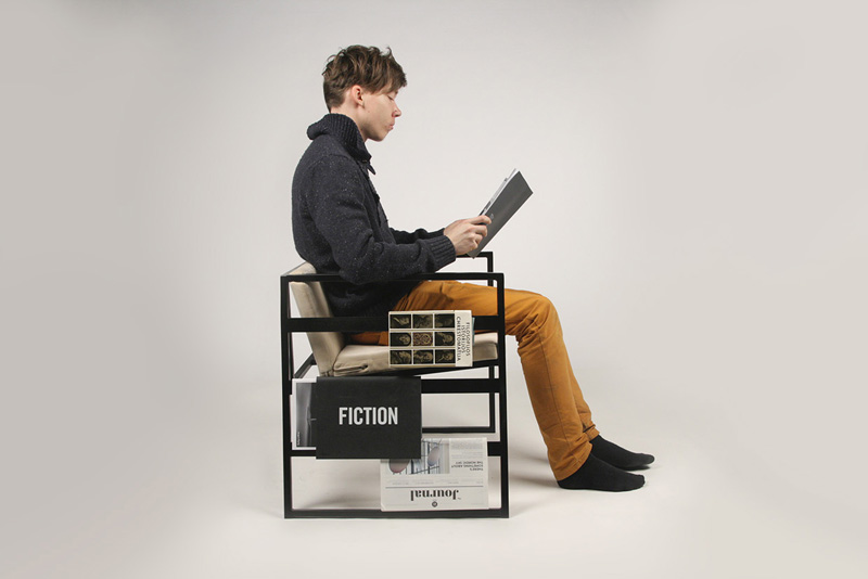 An armchair for people who read. One can hang books or magazines, that way keeping them organized. There is no need for bookmarks anymore. This piece of furniture fits most interiors, especially minimalistic ones.