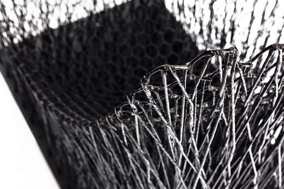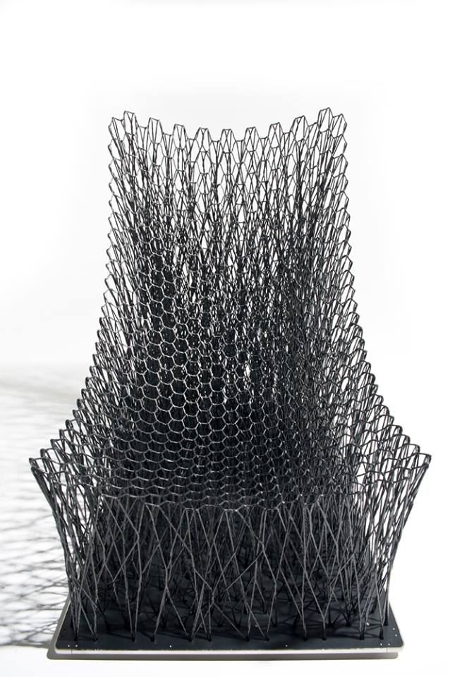To materialize this curve, a hexagonal shape  was used on the surface, and carbon fibre strings were woven from such surface to the metal base. Each carbon fibre string was allowed to find its most optimal position, resulting in a strong and efficient final product.