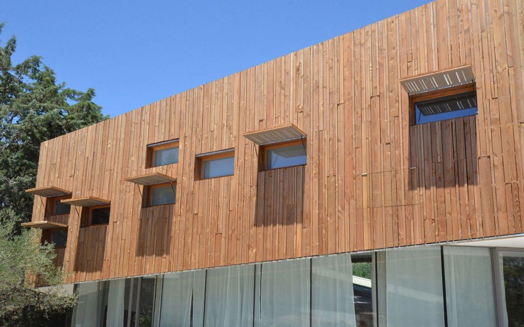 The wooden ribbon will literally be cut-out at the bed room’s level to intentionally create openings in front of the windows. The cut-out parts are kept and equipped with hinges and jacks to create the window’s natural shutters.