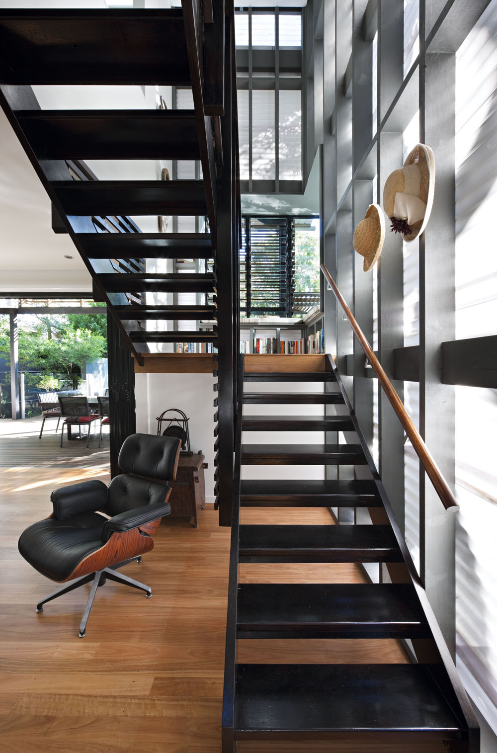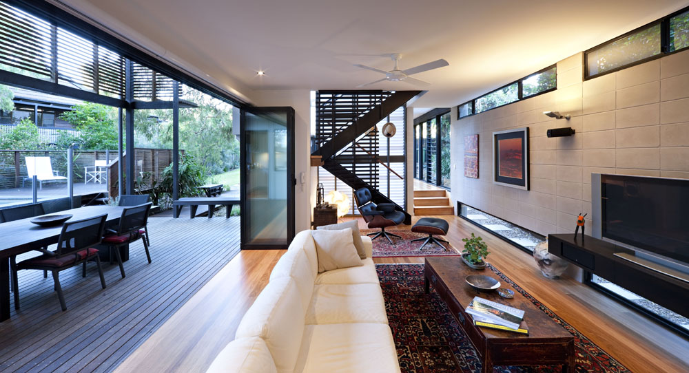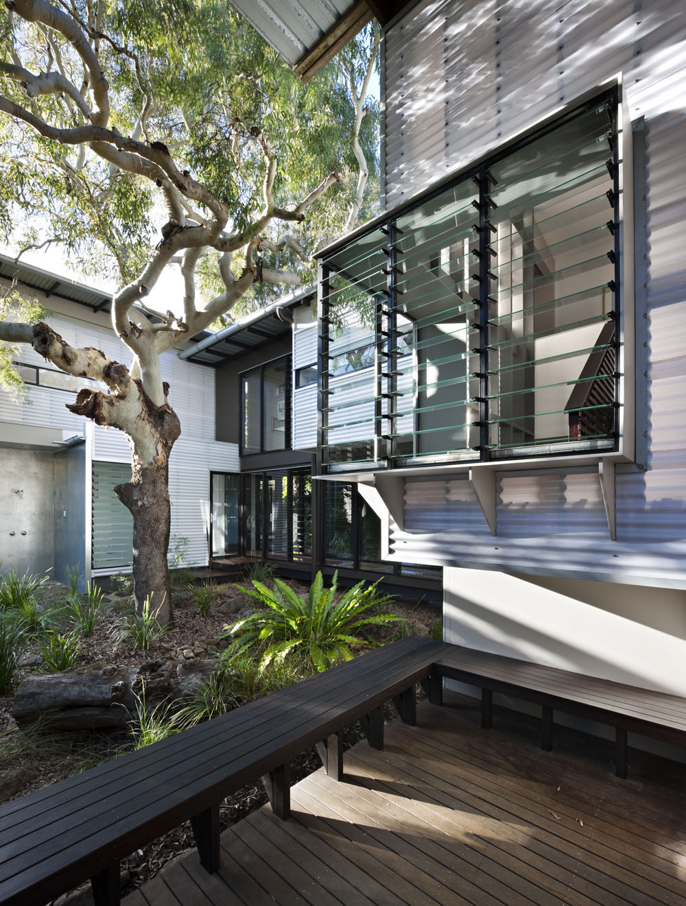The connection between the deck and living spaces is dynamic and direct. As the heart of the house, the covered double height outdoor room is actively used all year round as dappled sunlight is filtered through a timber batten screen hung below the roof structure. Indoor and outdoor realms are connected through an interlocking series of alcoves and nooks like a low edge deck seat and reading nook pop-out located off the stair landing. The courtyard and Morton Bay Ash are a focal point in which almost all rooms within the dwelling enjoy a connection.