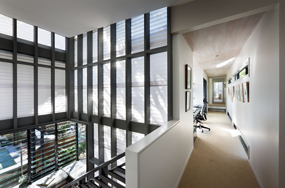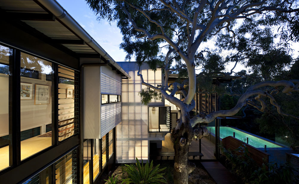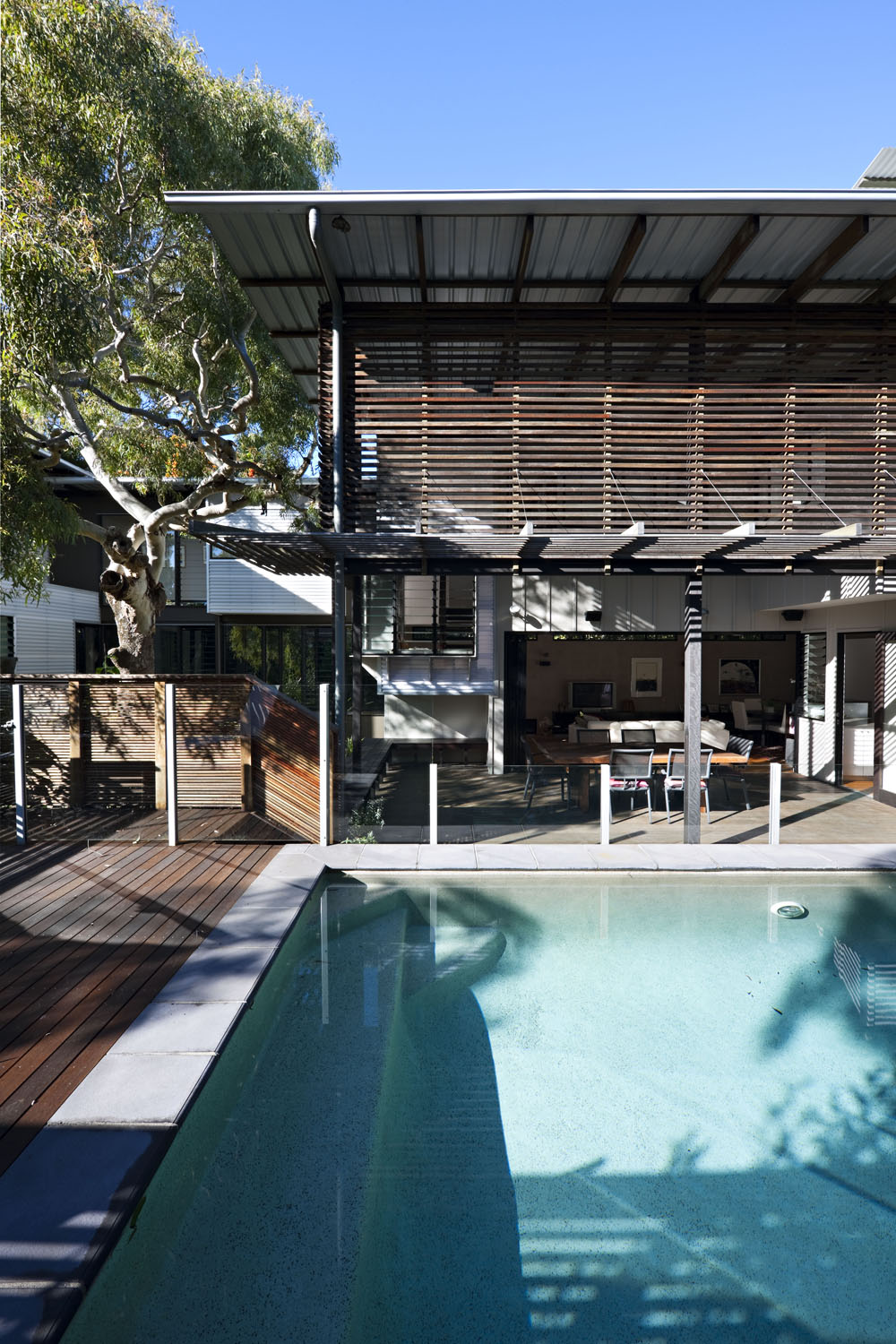 On approach from the street, the sloping terrain naturally guides an axial timber boardwalk under a simple timber pergola structure arriving in the courtyard opposite the Morton Bay Ash. The main pavilion to the west accommodates living spaces focused around a double height deck space overlooking the swimming pool and northern garden. The Master Bedroom suite is accessed via a polycarbonate clad stair tower that is by day a contemplative space and by night, a lantern. The Morton Bay Ash casts shadows onto the polycarbonate further animating the edges of the courtyard and bringing the landscape inside the house. The recent additions of a study ‘pop out,’ enclosed passage link below the bridge, Laundry and Powder room further animate the edges of the courtyard space whilst responding to the needs of its new occupants.