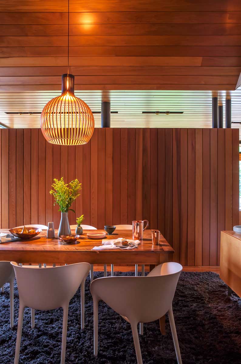 In Stage One, the interiors were re-defined, and a pavilion that flows out from the central core beneath a new fold of the roof was added. This houses a kitchen, living area and, behind a three-quarter height room divider, a cosy dining nook – a nod to that 70s style. Sarked ceilings and tongue-and-groove walls emulate the linearity and warmth of those in the original home, while built-in furniture such as cabinetry, shelving units and a breakfast pantry that juts through the external wall, are designed as separate elements in the space.