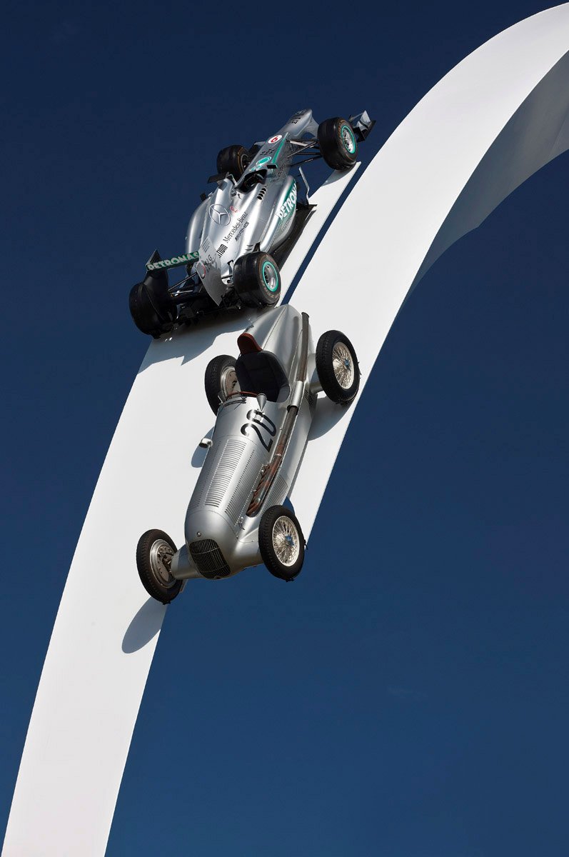 Mercedes-Benz can trace its motorsport origins back through three centuries, to 1894, when Daimler engines powered the world’s first winners on the rough roads of France. It’s appropriate then, that this year’s sculpture at Goodwood Festival of Speed represents that enormous span through thirteen decades. Soaring 26 metres over Goodwood House, this 160-tonne steel sculpture is 90 metres long and was created by artist Gerry Judah.