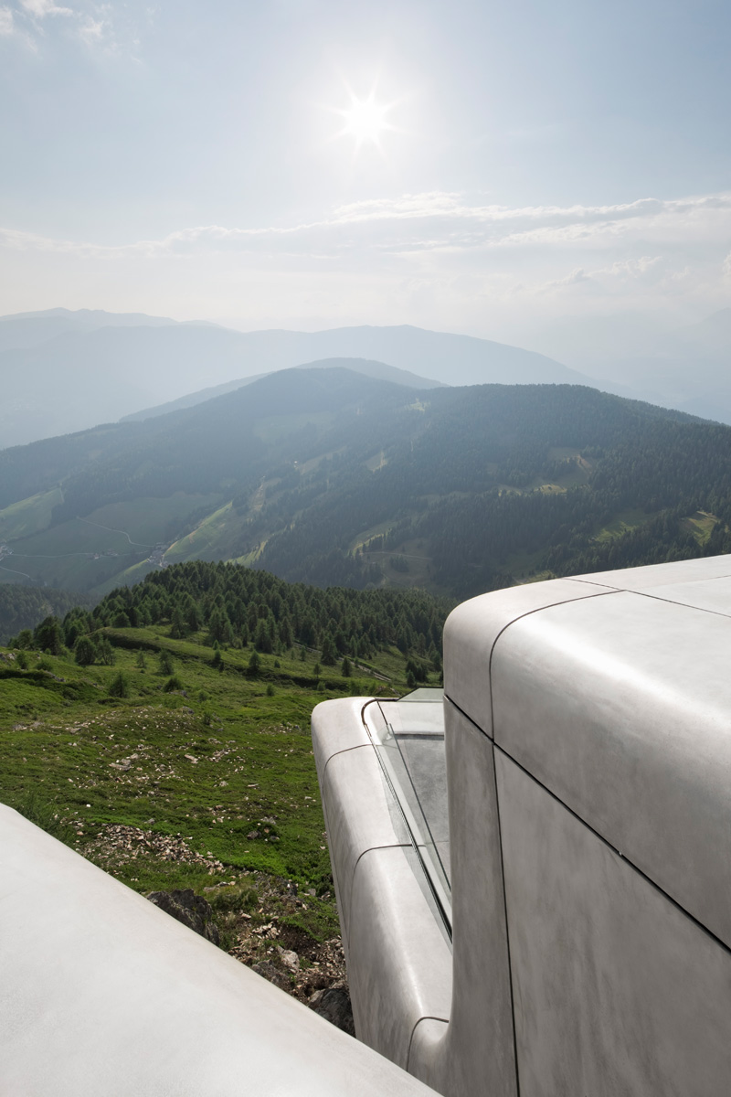 At 1,000 square meters, the museum is arranged over several levels to reduce its footprint. During construction, 4,000 cubic meters (140,000 cubic feet) of earth and rock was excavated and then replaced above and around the completed structure – immersing the museum within Mount Kronplatz and helping to maintain a more constant internal temperature. The wide windows allow natural light to penetrate deep within the museum, drawing visitors forward through the interior to the panoramic windows and viewing terrace cantilevered over the valley far below.