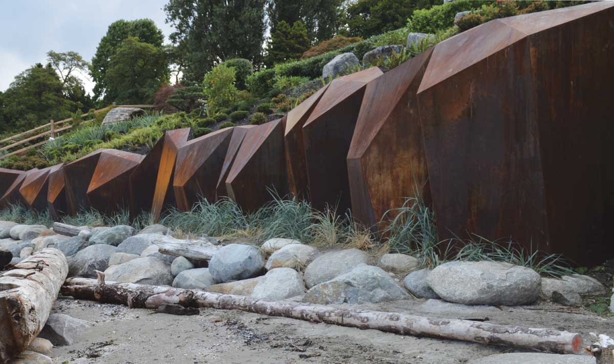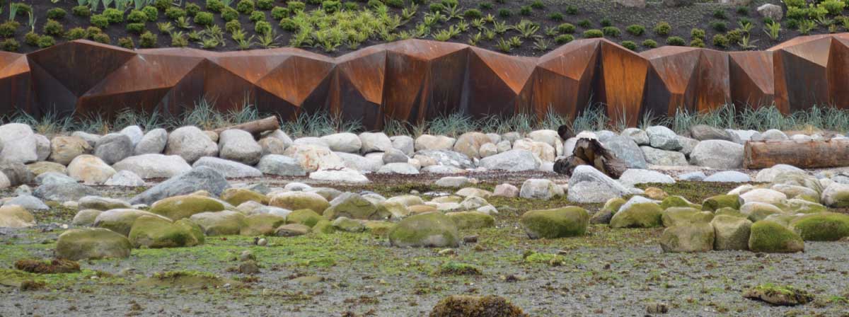 The firm worked with oceanic engineers – Balance Environmental, to develop a solution that would not only enhance the foreshore but also deal with the retention of the bank. Using corten steel Sangha drew inspiration from the abstraction of sandstone formations seen on Saturna Island here in British Columbia. This also became the formwork on to which concrete was shotcrete, and as a result, the corten wall became an artwork that was at the same time functional. The abstracted shape of the corten, in conjunction with strategic boulder placement along the foreshore played an integral role in dissipating wave energy and ultimately, facilitating the deposition of sand to enhance foreshore and create habitat for flora and fauna.