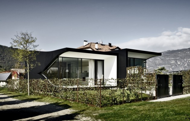 Both units are floating on a base above the ground evoking lightness beside offering better views from their cantilevering terraces to the impressive surrounding landscape. The volume opens towards east with a big glass facade that fades with curvilinear lines into the black aluminum shell. Mirrored glass on the west facade borders the garden of the client with the units and catches the surrounding panorama with pool while making the units almost invisible.