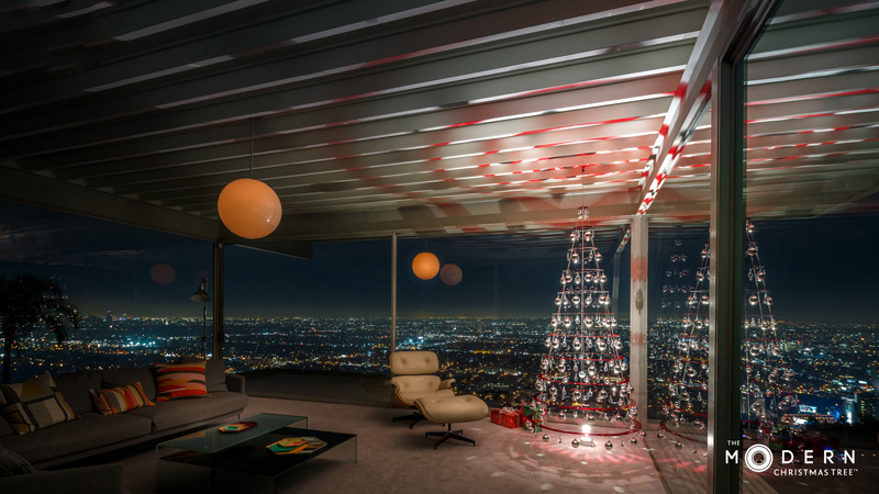 In a marriage of two classic modern designs, the legendary Stahl House, located in the Hollywood Hills, overlooking the Los Angeles skyline, hosted The Modern Christmas Tree for a photo shoot, which Matthew has shared with us.