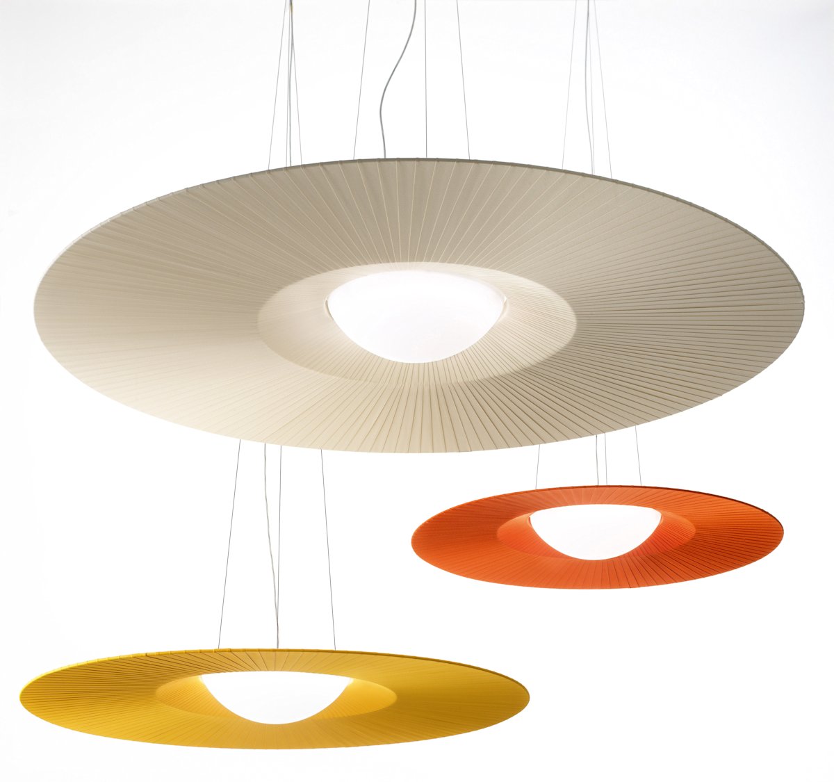 Lights and shadows calibrated to build light and coloured discs in different diameters, alternating original materials and refined hand finished pleated fabric and the large central half-spherical shade in opal PMMA finishing Soft Touch.