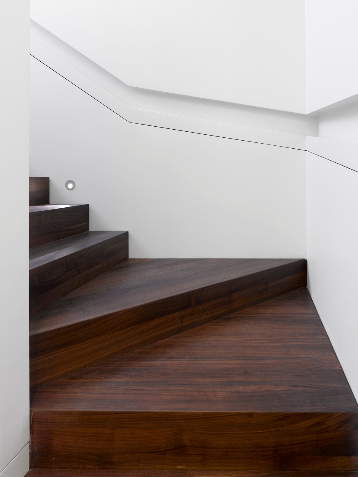 The house forms a complex figure-ground relationship. It is animated by light and shadow, and it is structured by a board-formed concrete wall, transparent partitions, interconnecting void spaces, and a large light well that slices through three storeys. The concrete wall satisfies building code restrictions on unprotected openings to the south while allowing light to reach deeply into the basement.