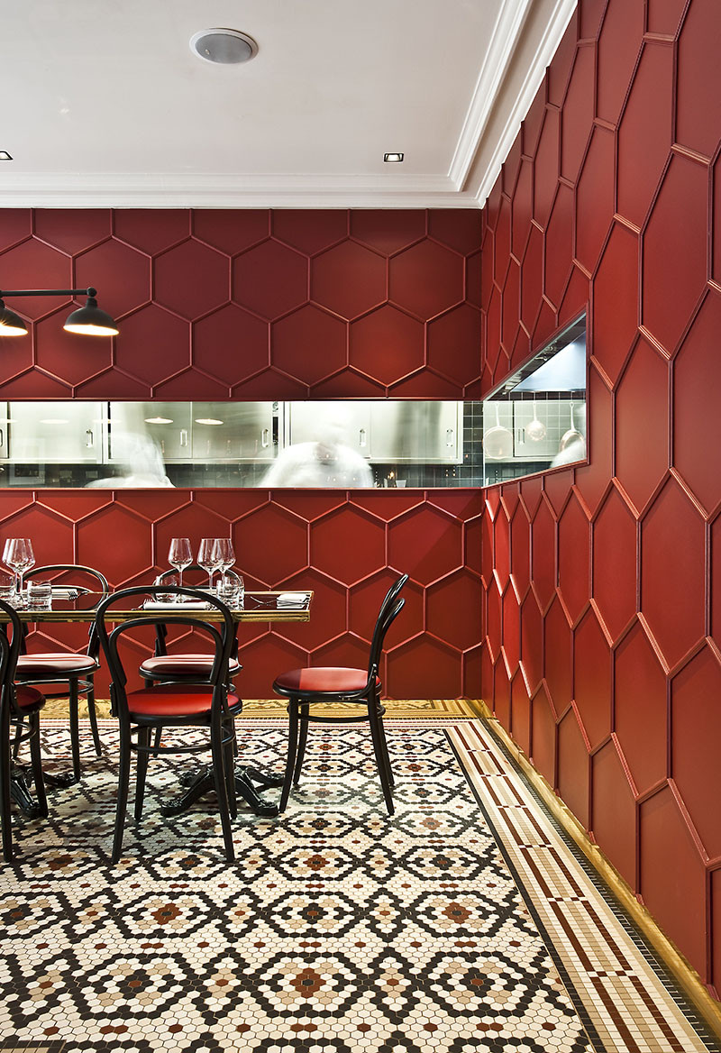 Each piece of moulding was cut to fit together, and then once installed the entire wall was painted in a deep red to draw attention to the wall and add atmosphere to the restaurant.