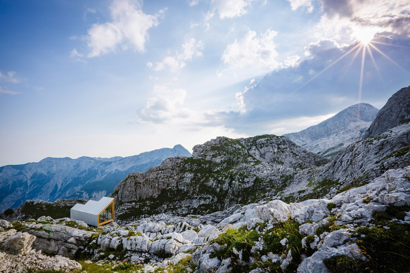 120 years after the installation of Aljaz Tower in August of 1985 on Triglav, this new shelter was placed below Mountain Skuta in Kamnik Alps. It is replacing a 50 year old bivouac that had previously been on the site.