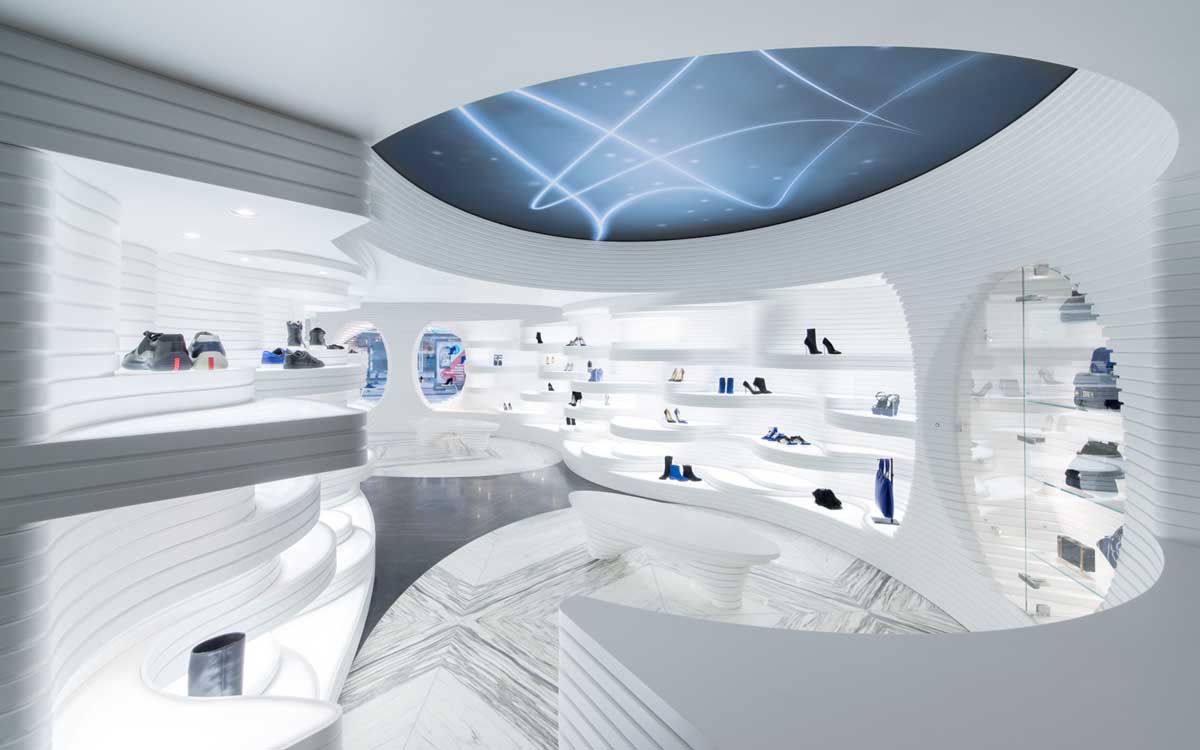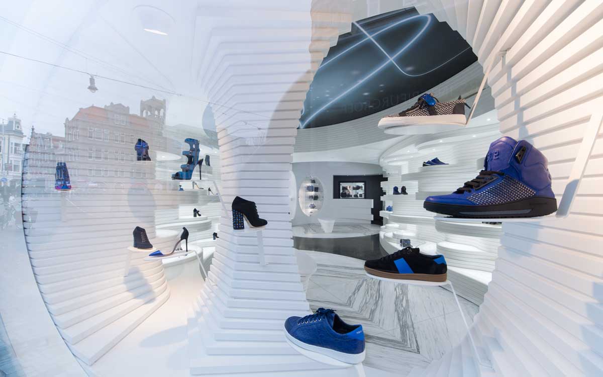A dynamic play of lines emerges from the openings in the display window, where varying heights of curving translucent surfaces, with integrated lighting, display the shoes.