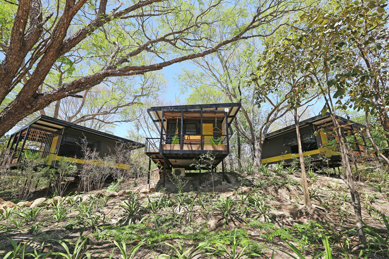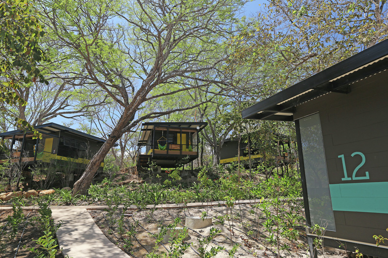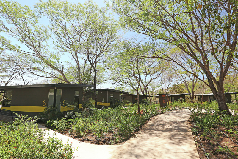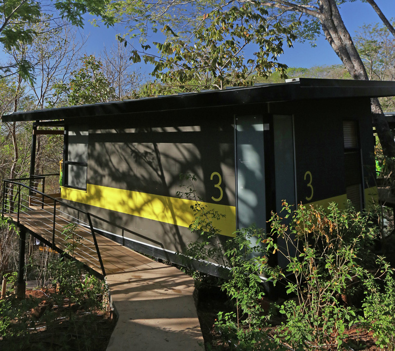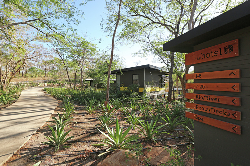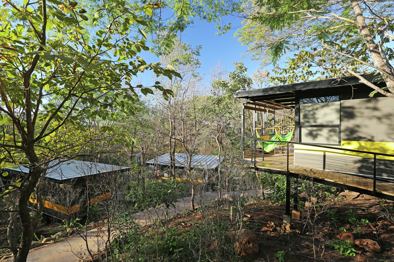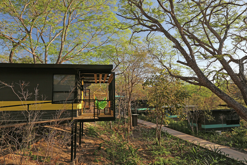 The three bungalow blocks of earthy gray tones are each emphasized by an inspired accent color relating to the river, rocks and trees of the surrounding area respectively – abstractly placing these bungalows in the tropical dry forest while permitting guests points of reference within the resort.