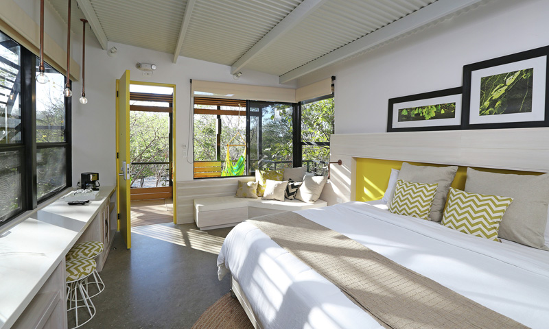 All furniture and accessories were designed exclusively for each space – including 1×2 meter beds that roll together to create a large king, and a third bed that slides from underneath that could accommodate an additional guest or child. Windows frame views of the sky, vegetation and wildlife emphasizing the where jungle meets luxury experience.