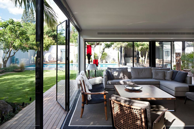 The terrace serves as the main hosting area of the old house and therefore features a kitchen with barbecue. The terrace overlooks the swimming pool and the main house. The windows that surround it withdraw into built-in pockets and when they are opened, the open space feels like an integral part of the garden.