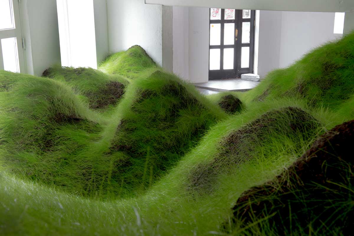 During Not Red But Green, Per Kristian Nygård constructed and grew a hilly landscape of grassy mounds, receding into an interior room. The grass sculpture was grown from seeds that had been planted a couple of weeks earlier during the extremely hot but short Norwegian summer. This meant that the already damp room created the optimal growing conditions for the sculpture.
