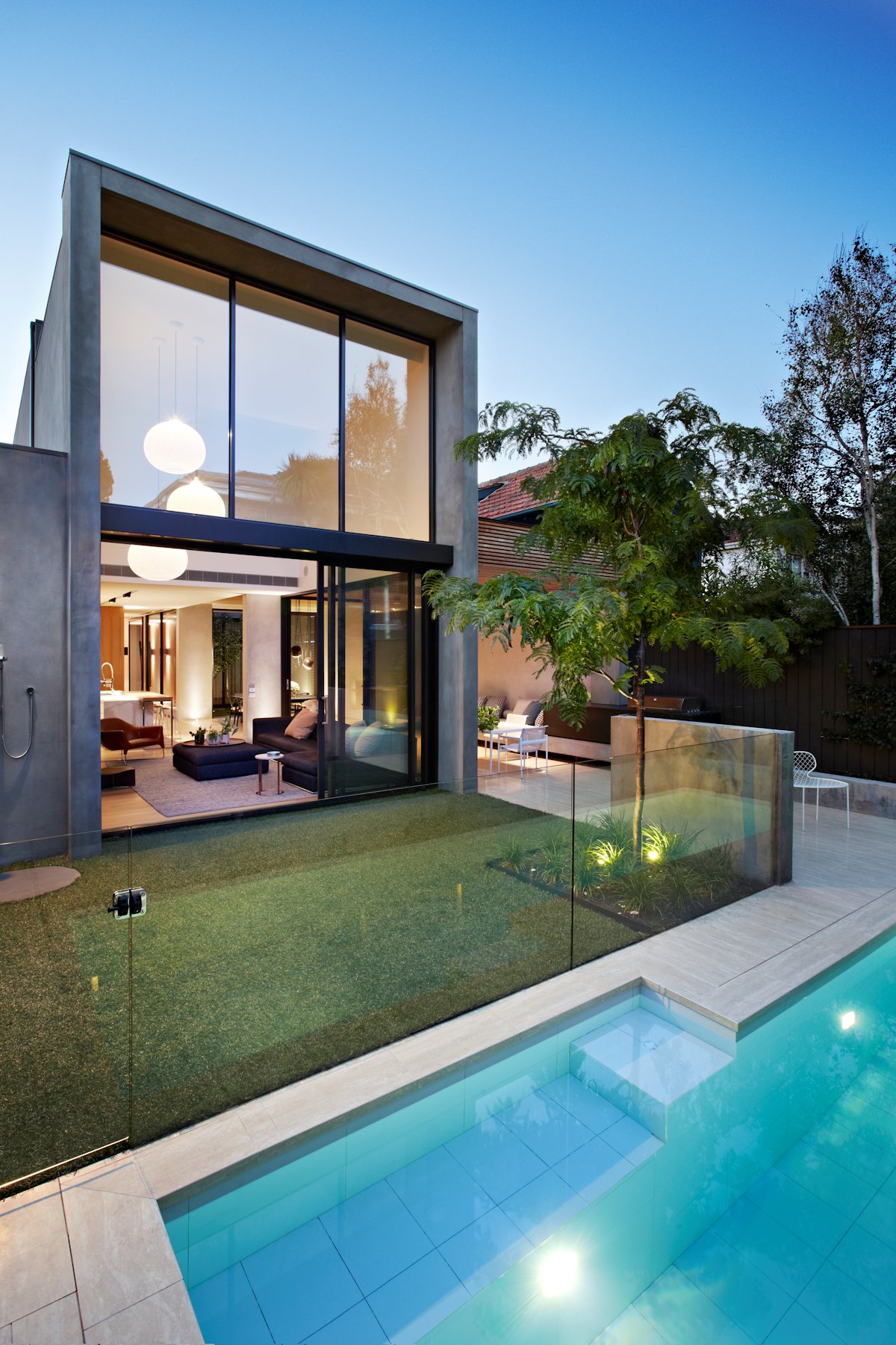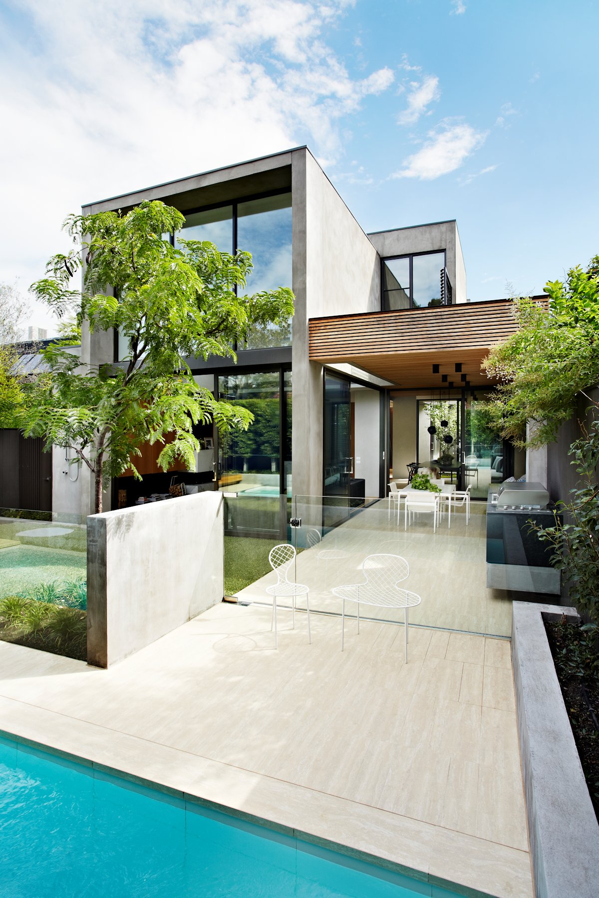The house accommodates 2 living zones, study, kitchen with butler’s pantry, 4 bedrooms with 3 bathrooms and a separate upstairs living zone. The two levels of the house are accessed by a lift and the house offers a rarity for South Yarra being a generous 2 car off street garage. Outside is an 8 metre pool and north east facing garden, tiled alfresco area for outfoor entertainment and discreet plant and equipment area. The house is orientated around a central courtyard providing northern light into the two living areas and a smaller north courtyard filles the study with a bright landscaped outlook.