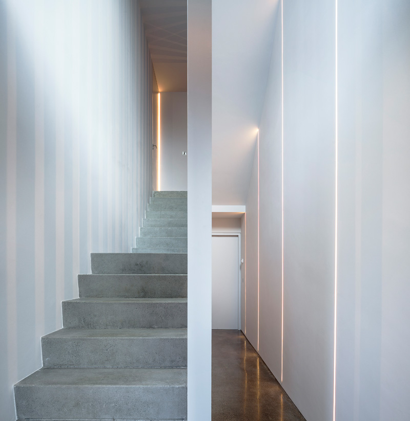 The concrete staircase leading you to the first floor has a timber fin wall which filters light across the stairs and links the ground level to the top storey. As you ascend the connection to the outside is constantly visible from ground to second floor.