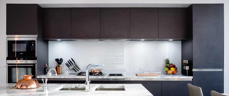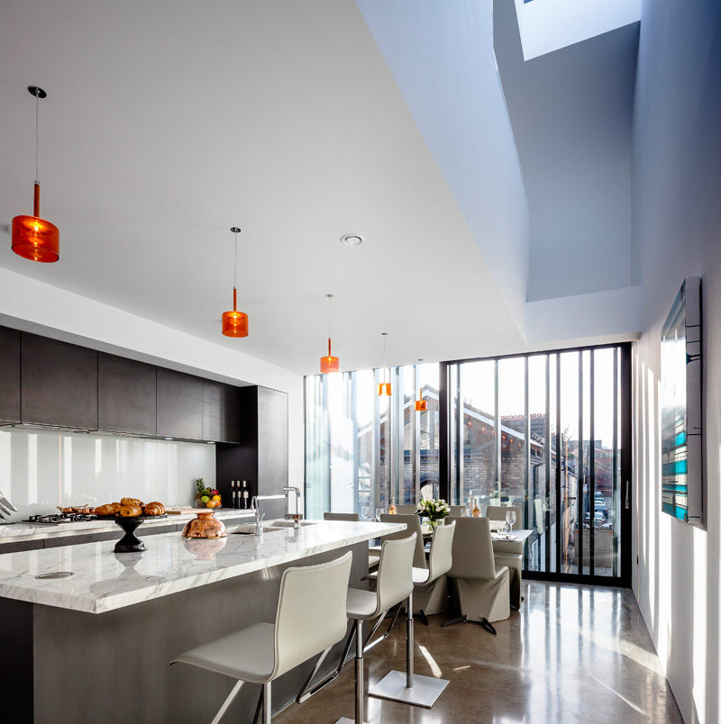 The kitchen space at first floor sits behind a metal fin screen which provides both privacy and shading from the exterior and access to a terrace overlooking the street below and connecting visually back into the vertical stairwell. The kitchen space connects to the living space above spatially with a double height void bringing light and air to the middle volume.The kitchen has a power floated concrete floor throughout with marble topped kitchen units and island.