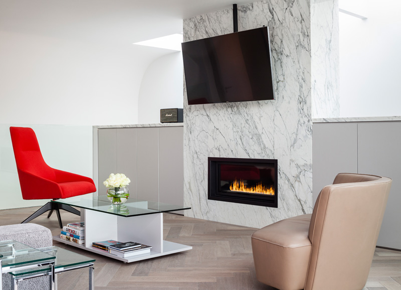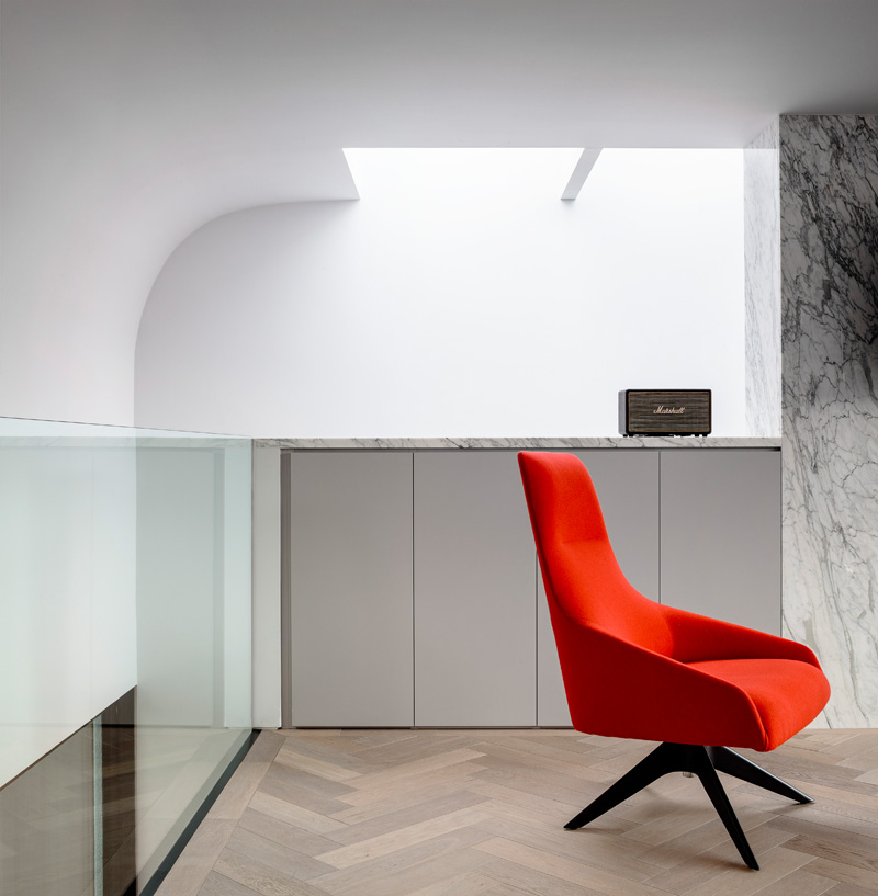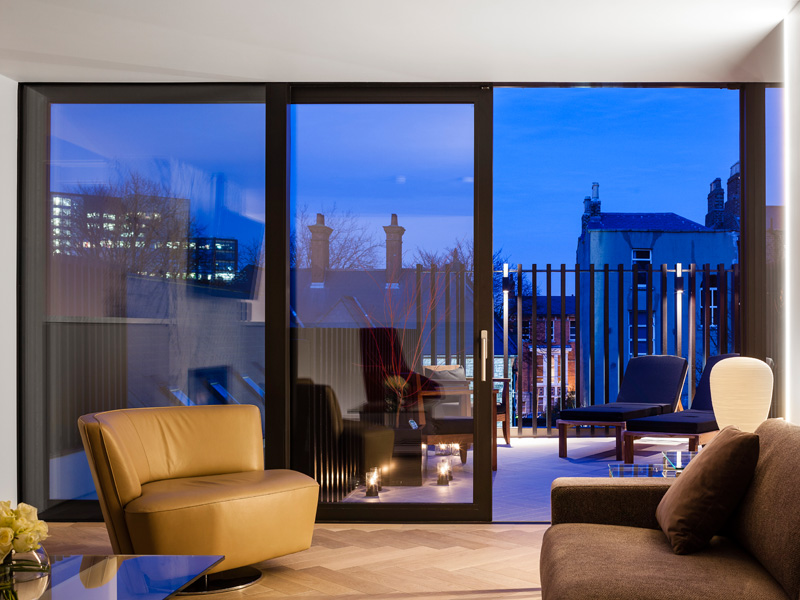 Internally the concrete stairs acts not only as a physical connector but also brings light, refection and shadow down through the building.Each dwelling has been finished to a high specification with underfloor heating throughout and aluminium triple glazed thermally broken glazing as standard.