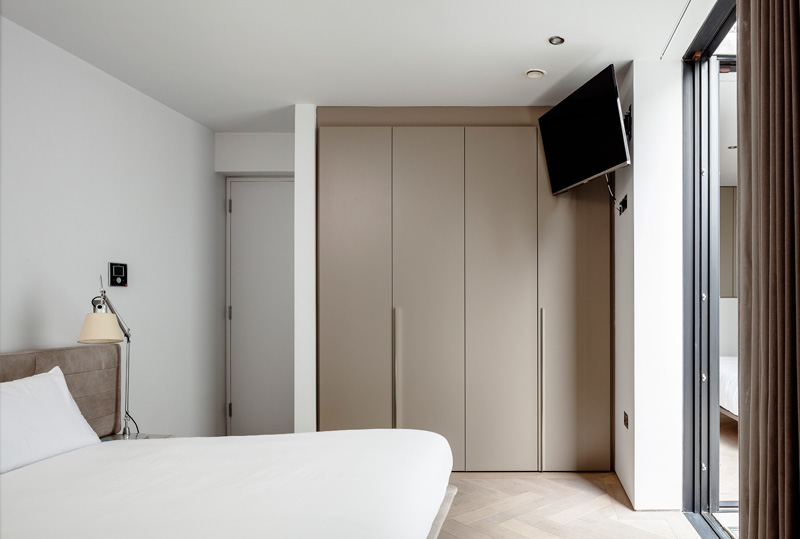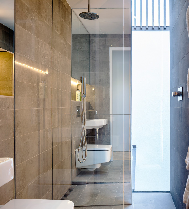 At entry level a power floated concrete route leads you to two ensuite bedrooms each with floor to ceiling glazing and direct access to a private planted external courtyard. Each bedroom has bespoke fitted storage units.