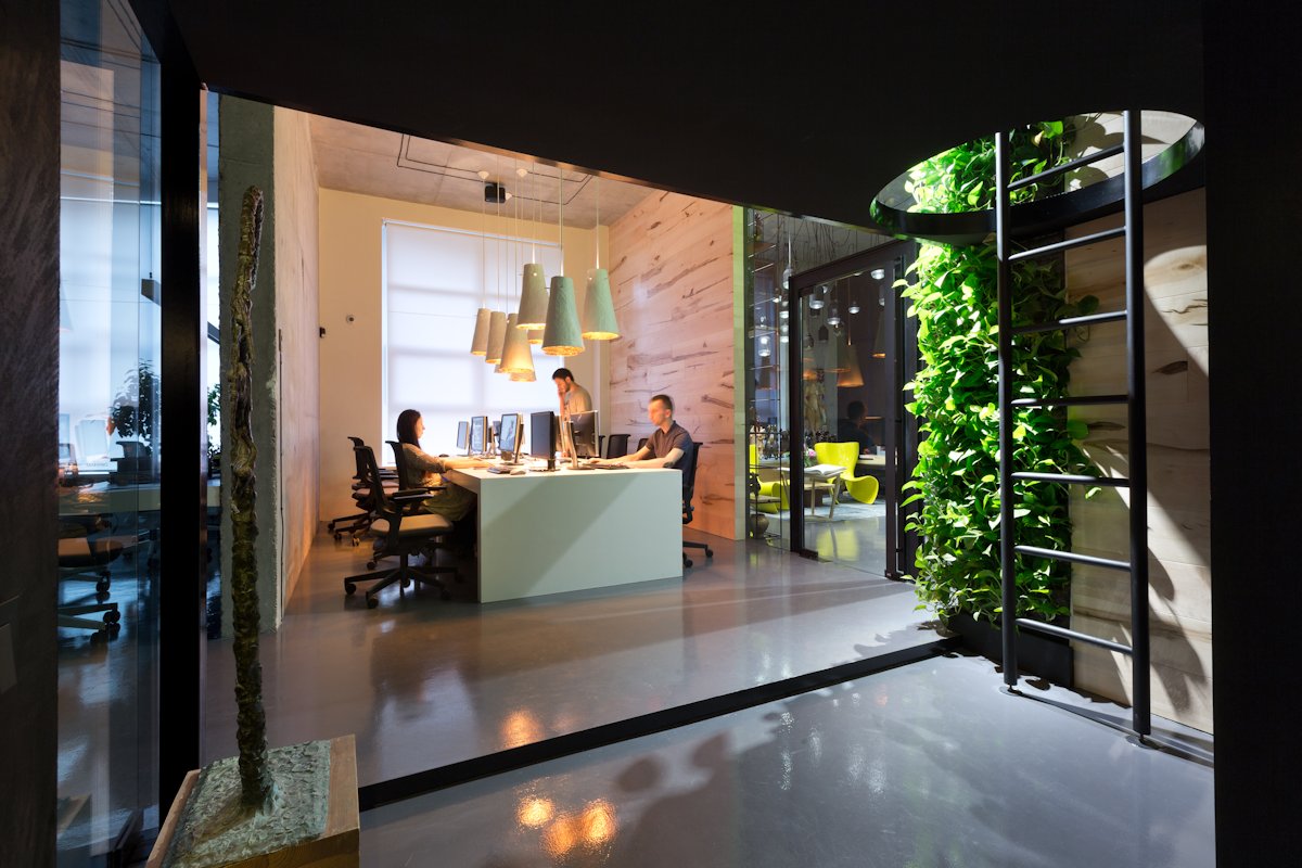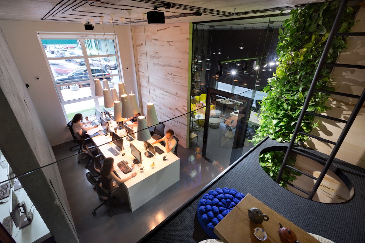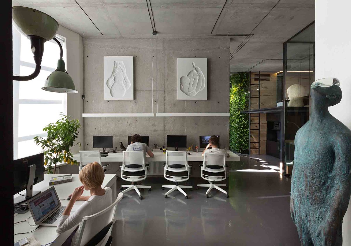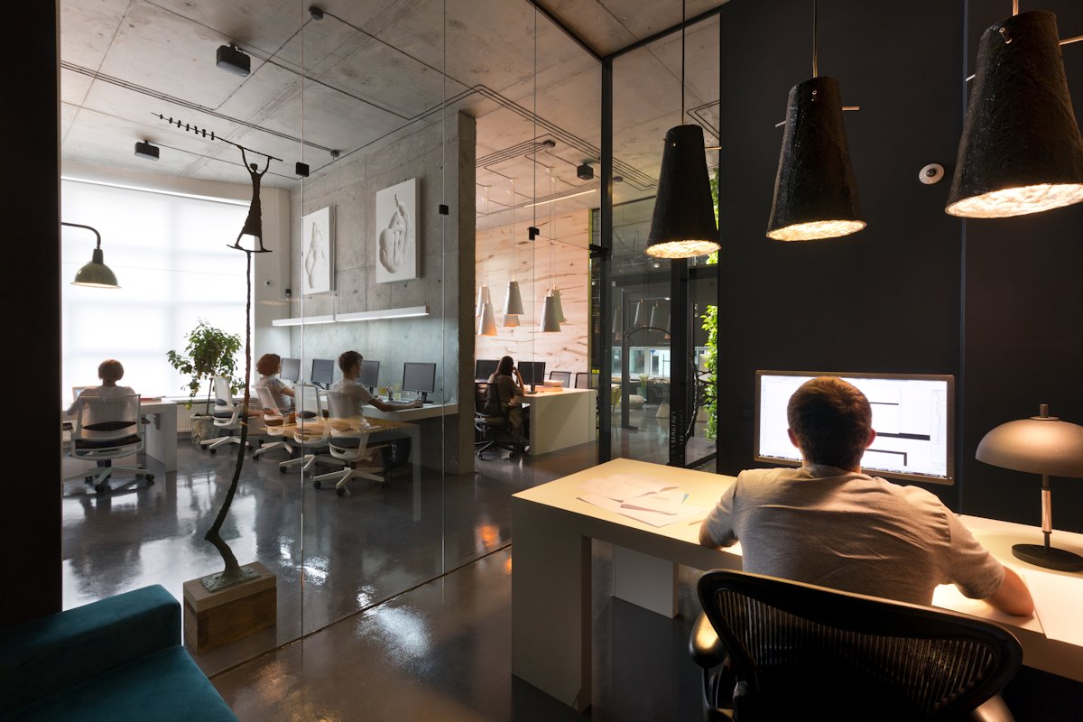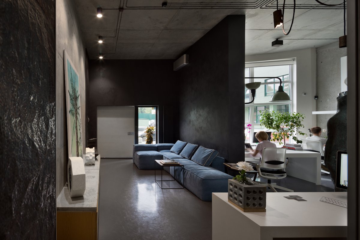 The interior design was created by the studio owner with deep love and attention to his team and their common cause. Therefore, it has a function of an open home space with convenient comforts such as a cosy kitchen, bathroom facilities and a lounge zone.