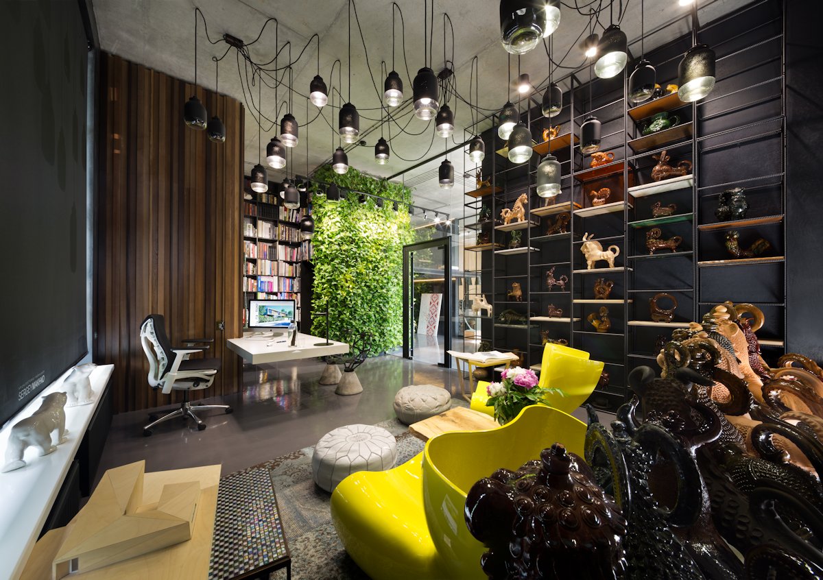 An important element in the workshop is a rich collection of Ukrainian zoomorphic ceramics that integrates harmoniously with the laconic concrete walls and bright Marc Newson “Auflet chairs”.