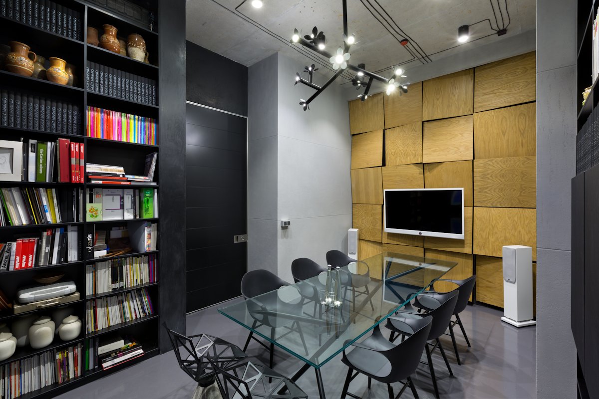 Entering through the three-meter high door you will find a spacious business venue for conducting important events and meetings. It is also decorated with the author’s chandeliers and wooden panels. The room is furnished with Sergey Makhno glass table and Kristalia “Elephant chairs”. The collection of Ukrainian ceramics decorates the library which counts more than 1000 books on design and architecture brought from all over the world.