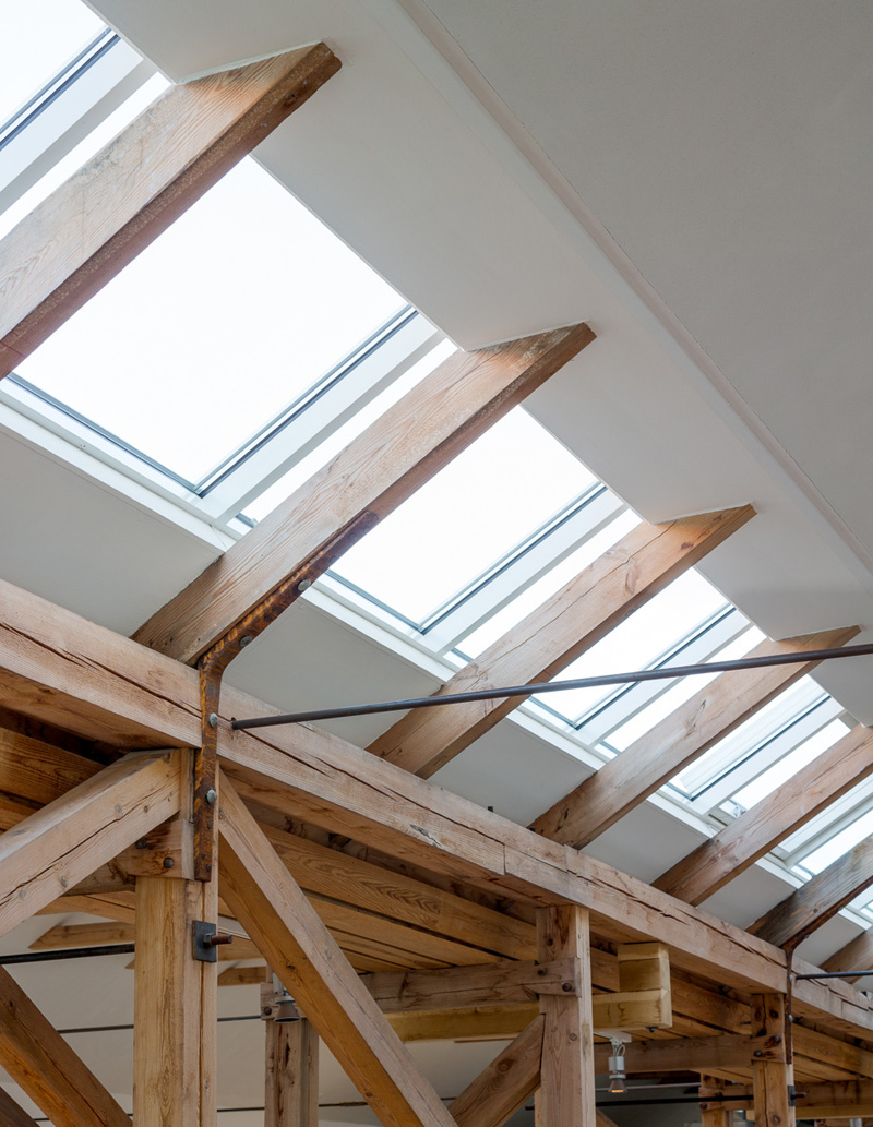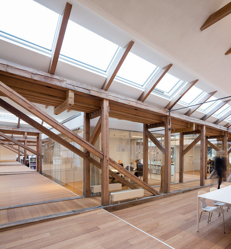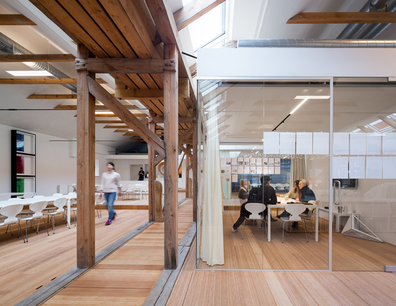 White walls, white desks and glass enclosed meeting rooms express this vision. The historic wooden structure is revealed throughout, which softens the interior.
