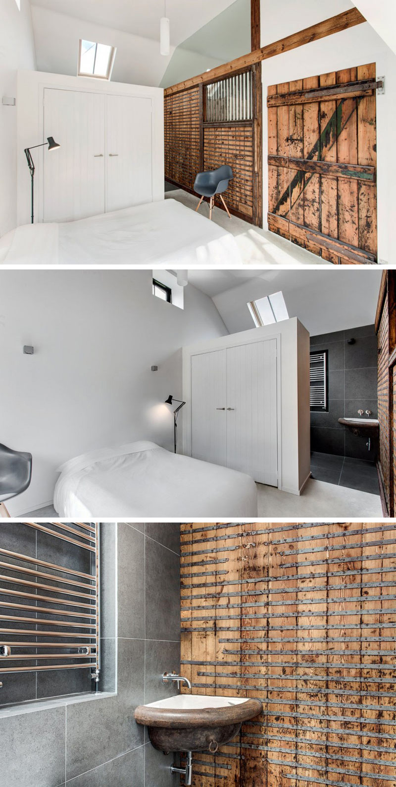 A large white wood wardrobe separates the bathroom from the living area in this bedroom. Original metal bars from the stable provide an easy way to look out at other parts of the house without leaving the room.