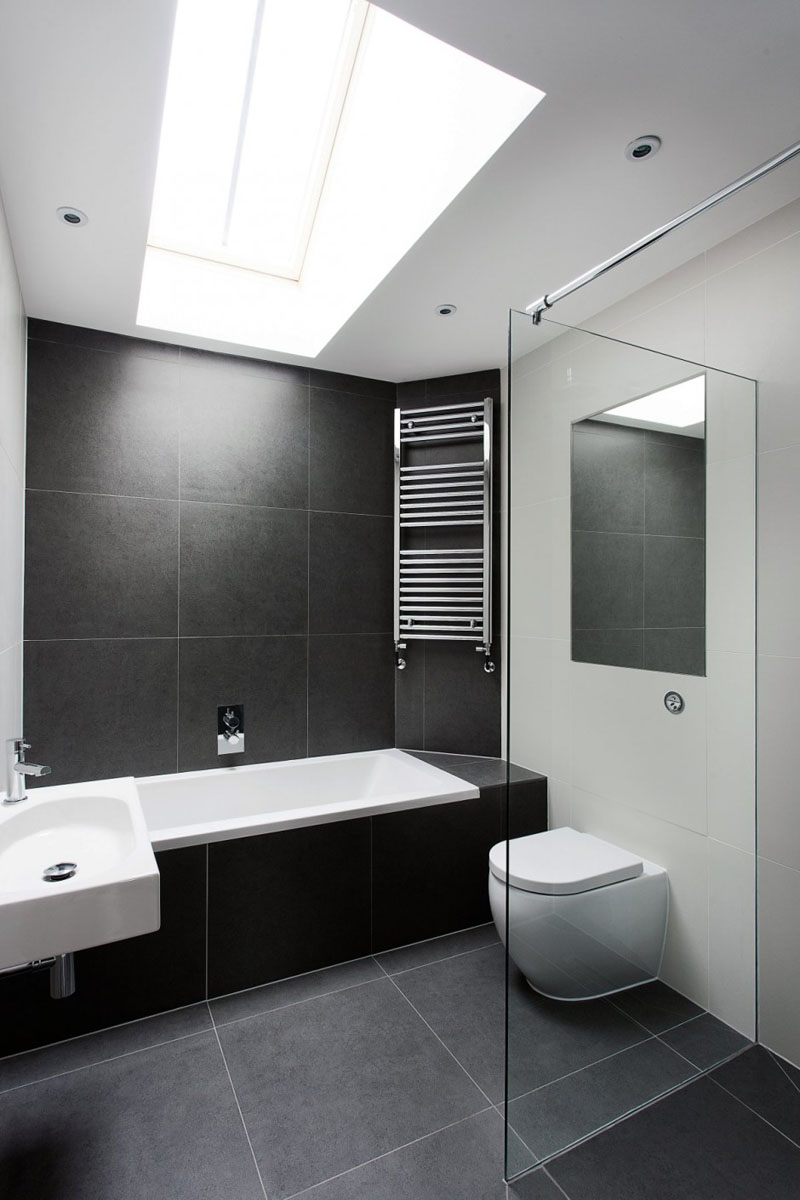 In the final bathroom, none of the original features of the stables are used. A skylight shines light on to the large dark grey tiles used throughout, and a glass wall separates the shower area from the rest of room.