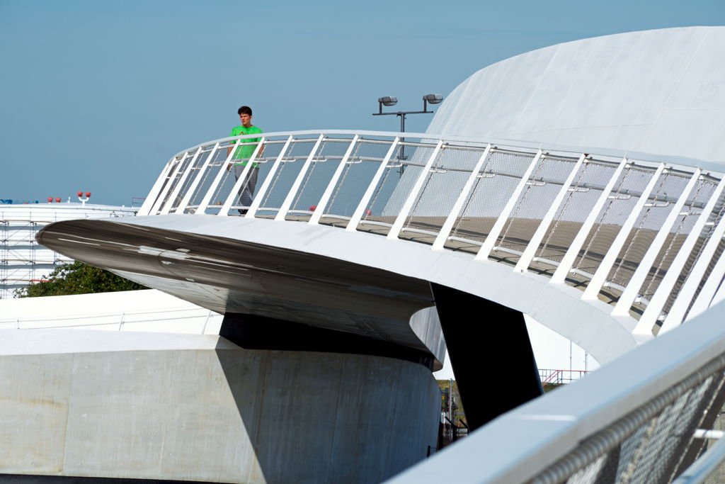 The combination of design strategy and safety requirements has resulted in a bridge with an elegant, curved and sculptural form. The construction, with a total length of approximately 170 m, consists of a continuous five-part girder, which allows some 70 m to be spanned at the harbour entrance. Viewed from above, the bridge appears as a lightly undulating S-shape, which, at its north end, culminates in a circular access ramp: a 14-metre spiral, constructed of white concrete. On the side facing the oil terminal harbour, for security reasons, the ramp becomes a gently curving white wall, thus fulfilling the stringent safety requirements. By contrast, towards the River Main, the bridge opens up to allow unobstructed views of the river.