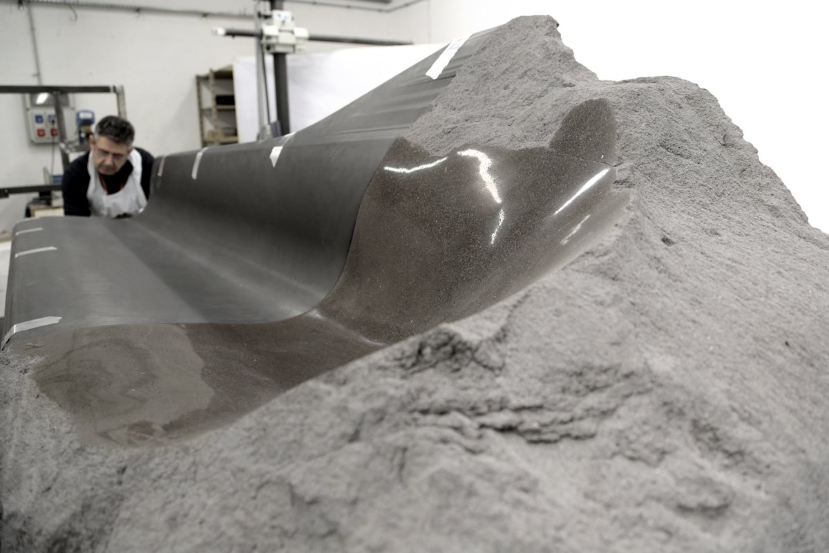 Pierre Gimbergues has designed ONYX, a carved sofa made from carbon fiber and Volviv lava for Peugeot Design Lab.