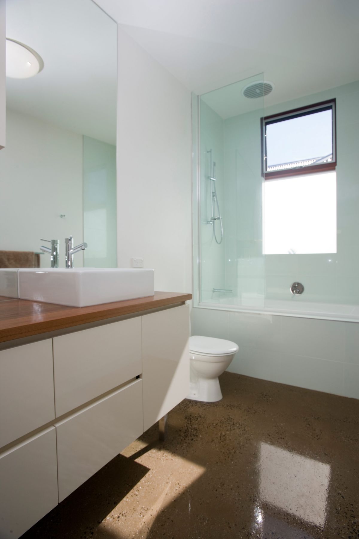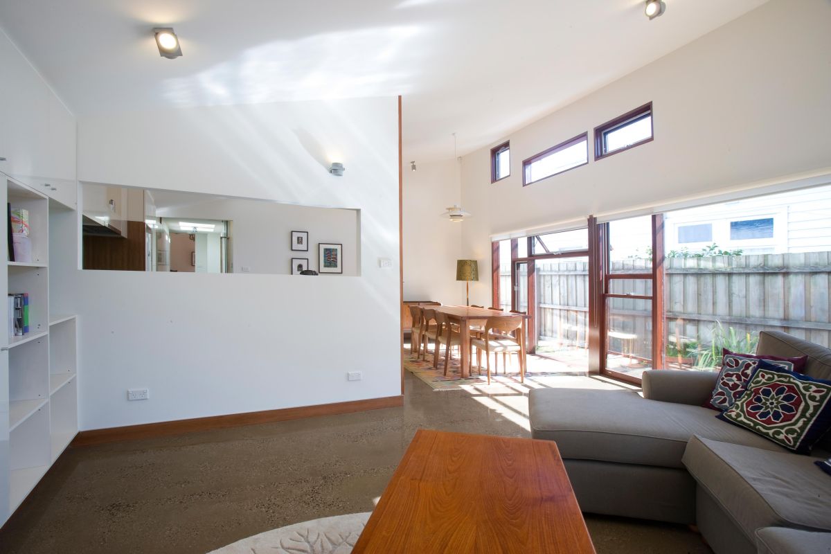 The roof pitches down to the south, preventing overshadowing of adjoining properties and assisting natural ventilation circulating through low and high level openings. An insulated floor slab with embedded hydronic heating coils and double glazed Jarrah (Class 2) windows, provides a low energy solution to achieve a high level of internal comfort. Steel mesh awnings are calculated to exclude summer sun and allow winter sun to penetrate the interior spaces, subsequently storing its heat within the thermal mass of the floor slab during the cooler months.