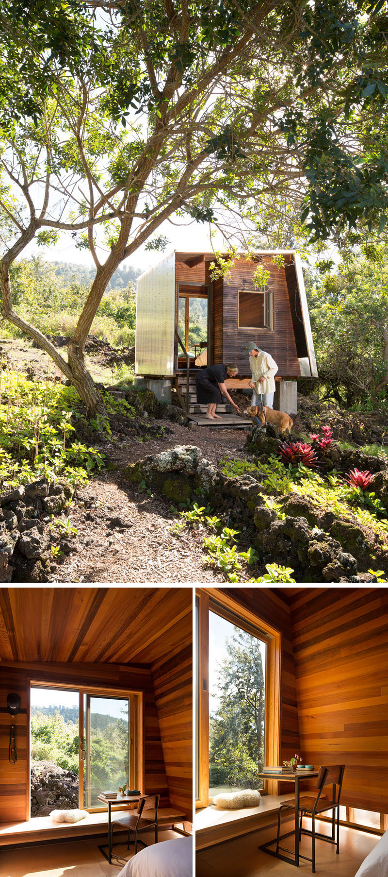 The first pavilion (enclosed pavilion) is named Mauka after the Hawaiian word for “inland toward the mountains.” It houses a small bedroom that looks out towards the lava flow through a large sliding window. Inside, the walls are covered in wood and there’s just enough room for a bed, a built-in bench and a small desk with chair.