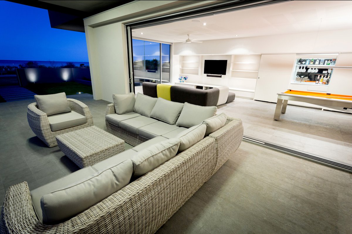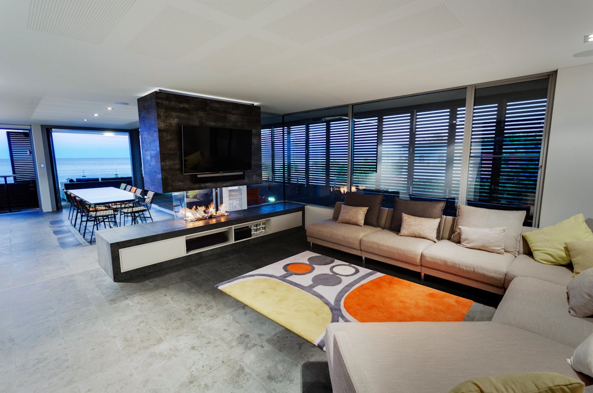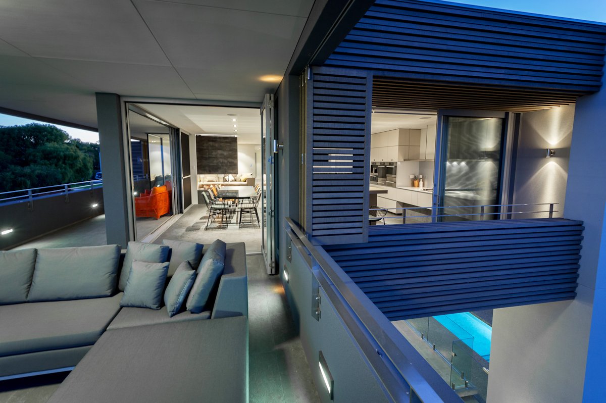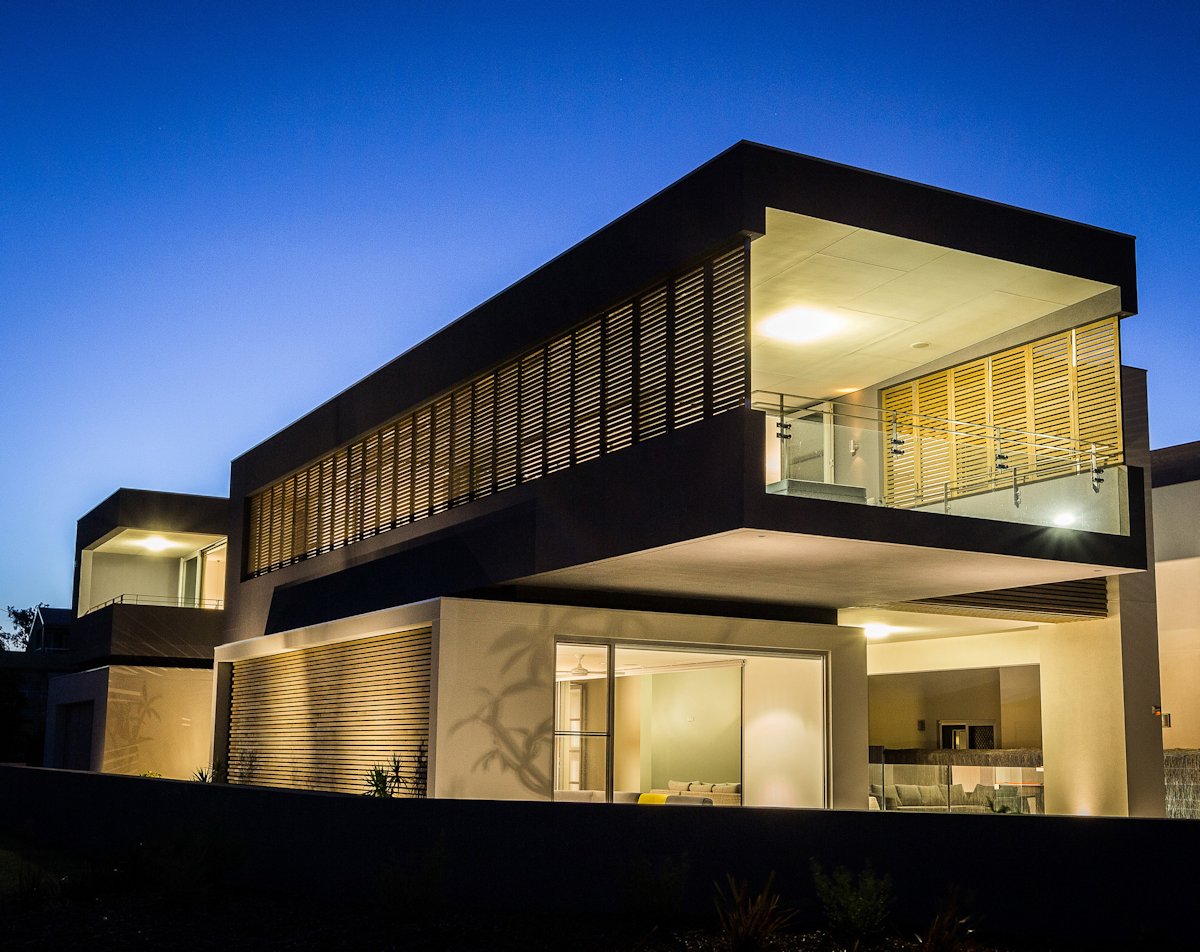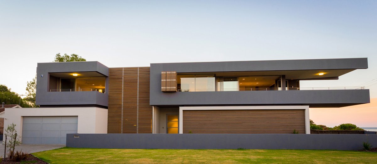 The cantilevered balcony puts you so close to the beach you can just about make the jump. Shutters clad with sawn timber battens adds a balance of texture to the rendered and glass façades.