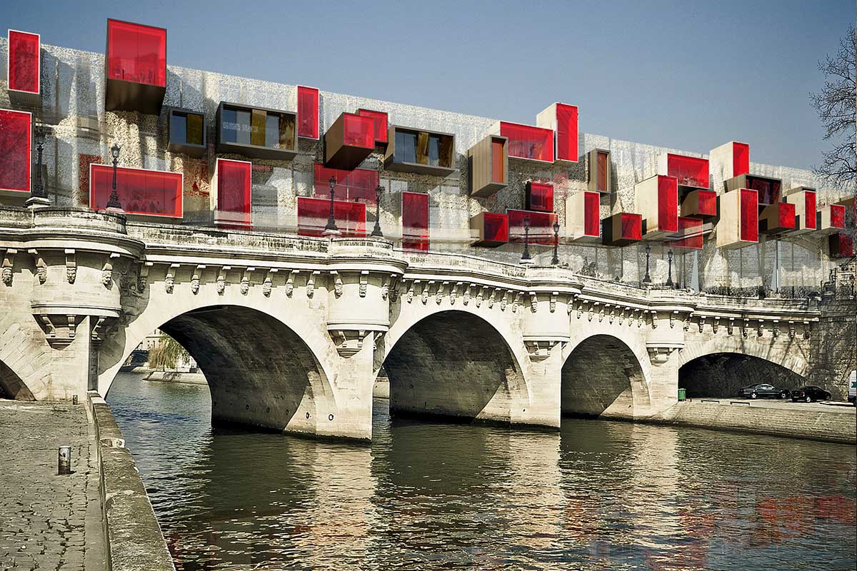 Malka Architecture have designed a concept for a nomadic micro-city that positions itself on a bridge in Paris, France.