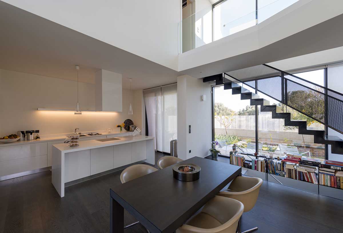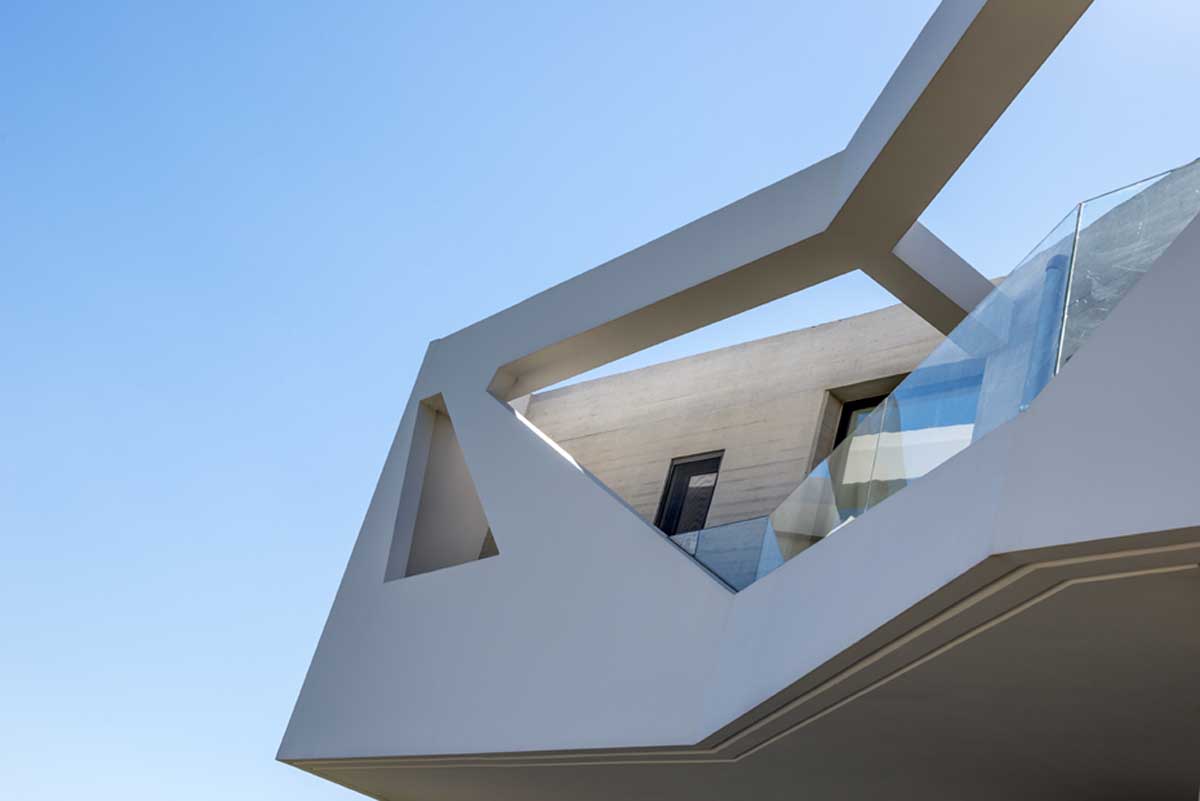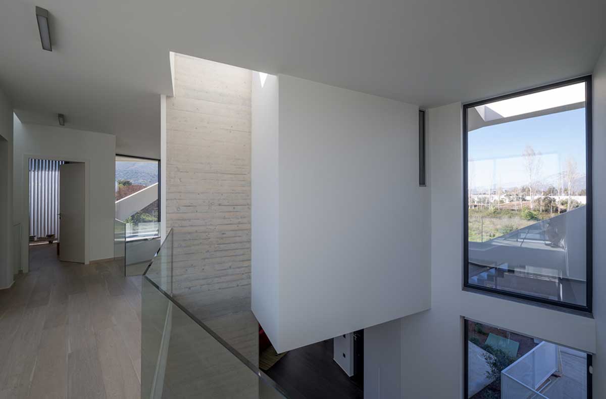 The layout of the three white cubes creates a small village inside the house. Each cube was designed as the “home” of the different members of the family. This is the private part of the house while the ground floor is the “public”. The three cubes are almost hanged from the ceiling as double height voids separate them make the house feel larger than it is and creating internal views and facades. The three cubes are connected with corridors- bridges- standing points. Small or larger balconies being part of the cubes or cantilevered by them creating an organic like façade which follows graphically the plan of the house.