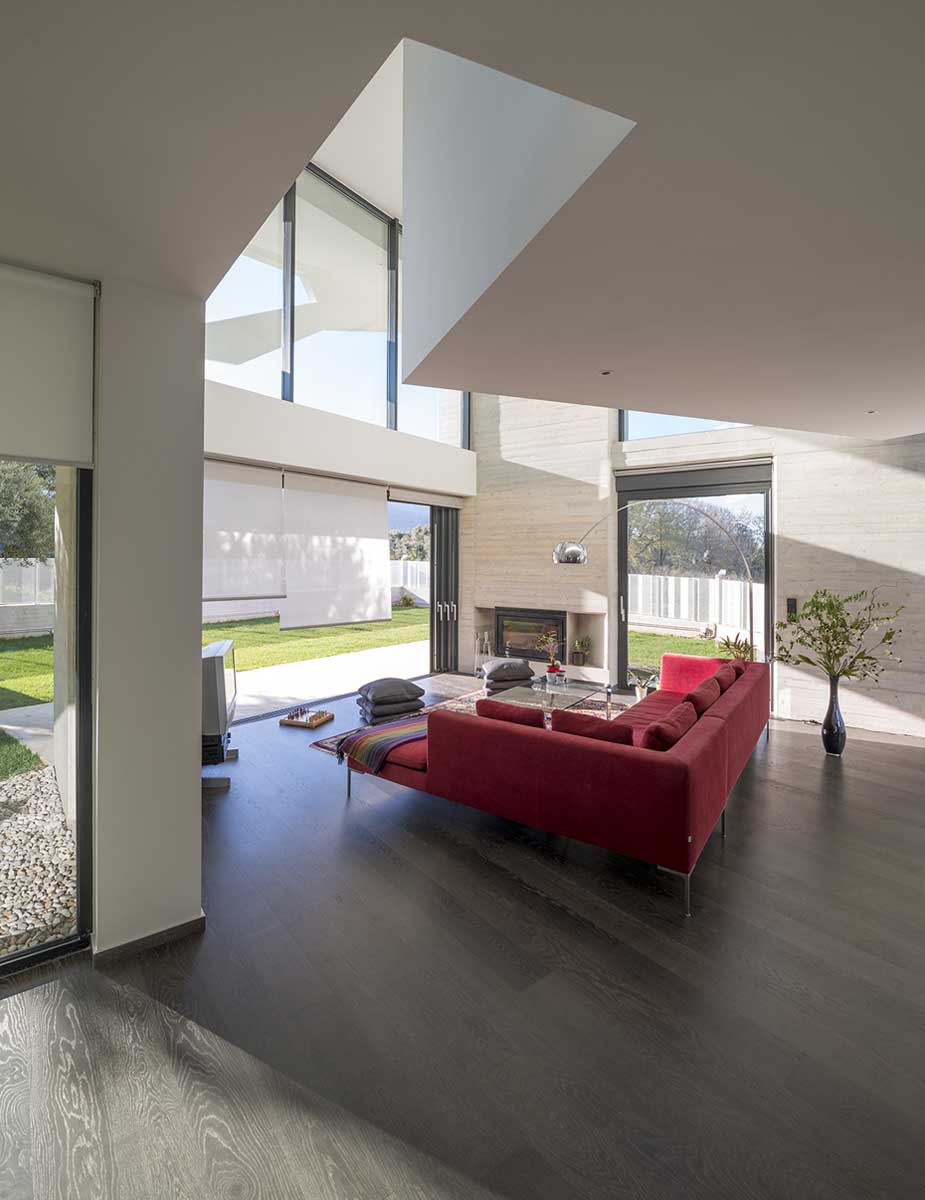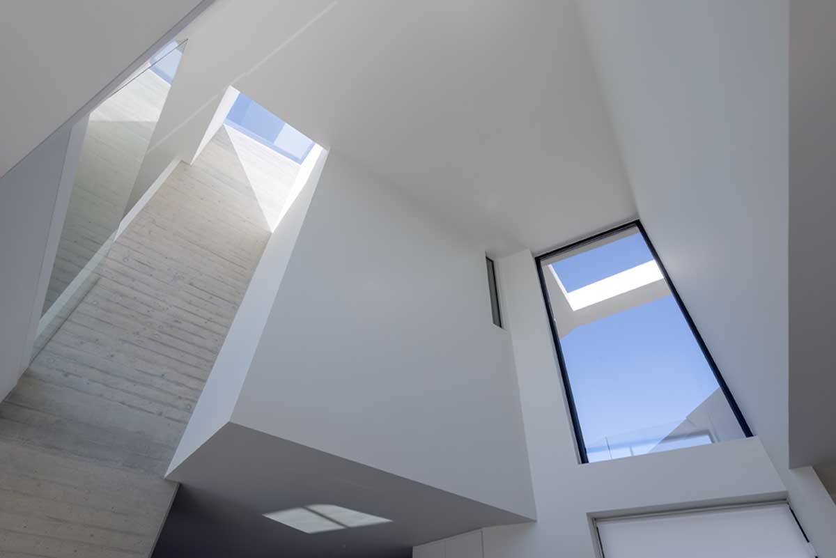 To these external walls that were made by exposed concrete we added three volumes that created the light wells and the structural support for the house. They became empty volumes that ended up at the roof as light chimneys. The void becomes the structure.
