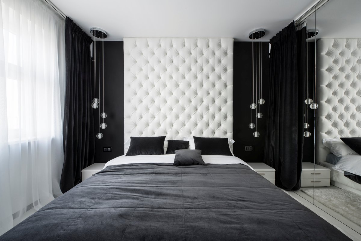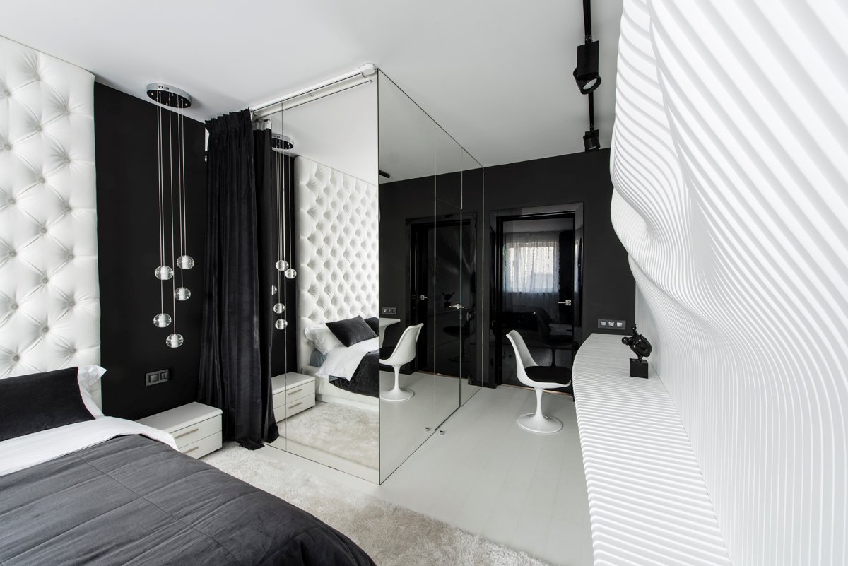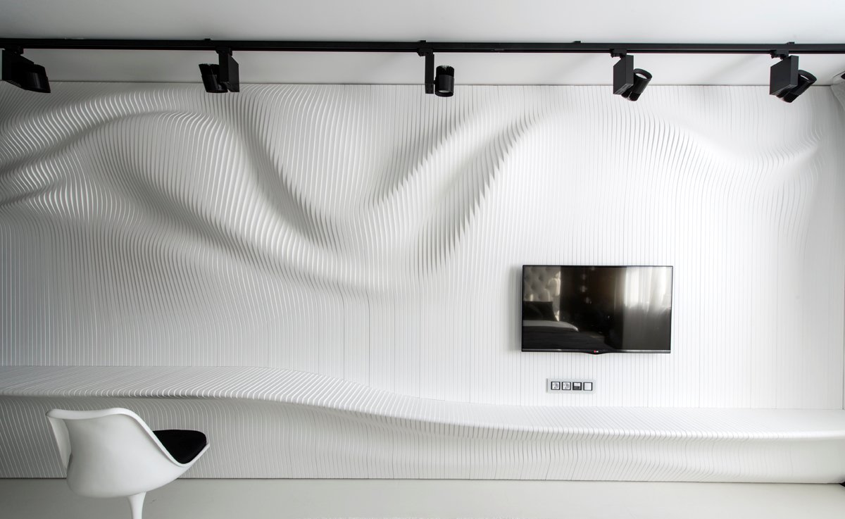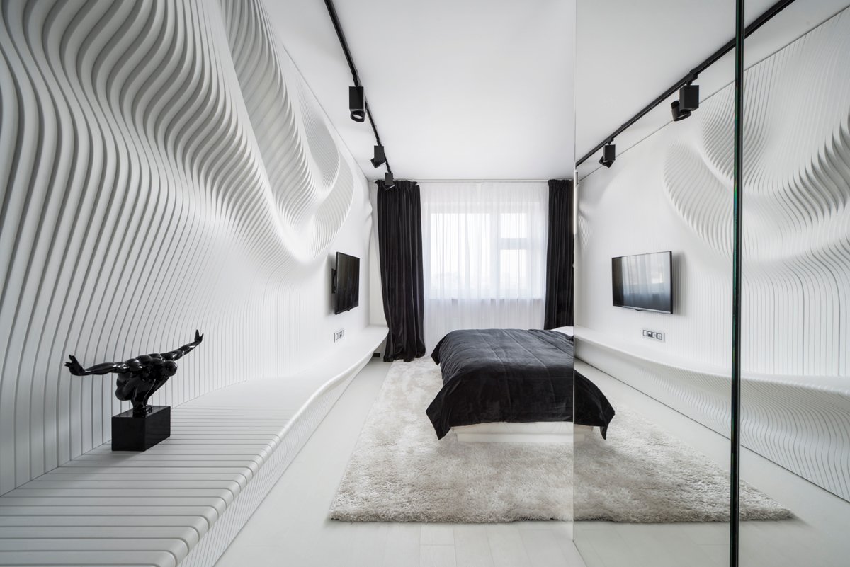 Geometrix Design have completed a black and white bedroom featuring a wavy wall.