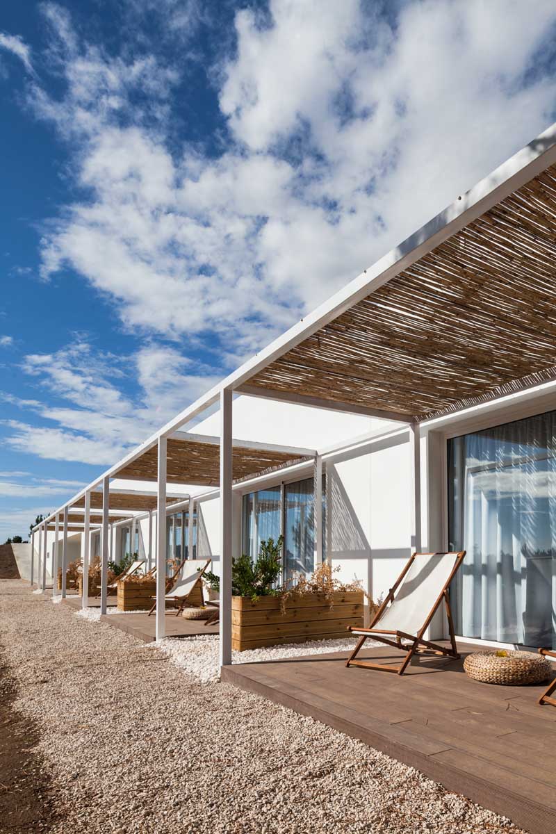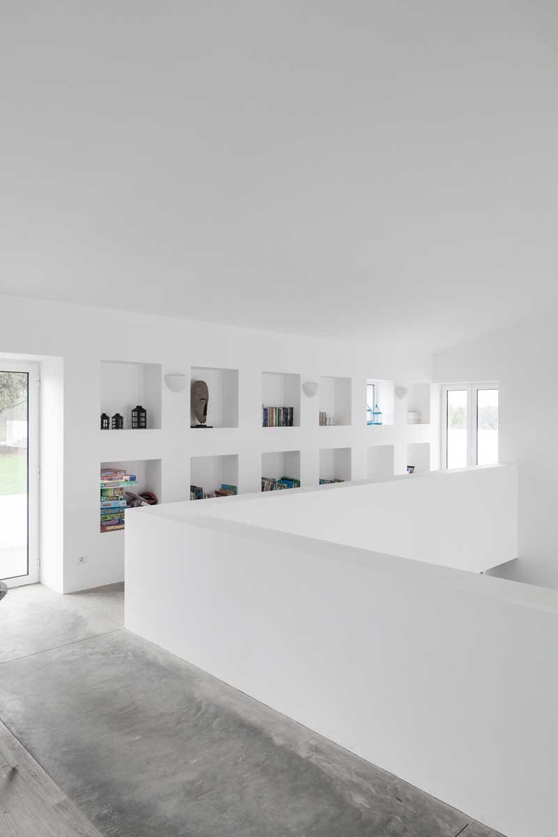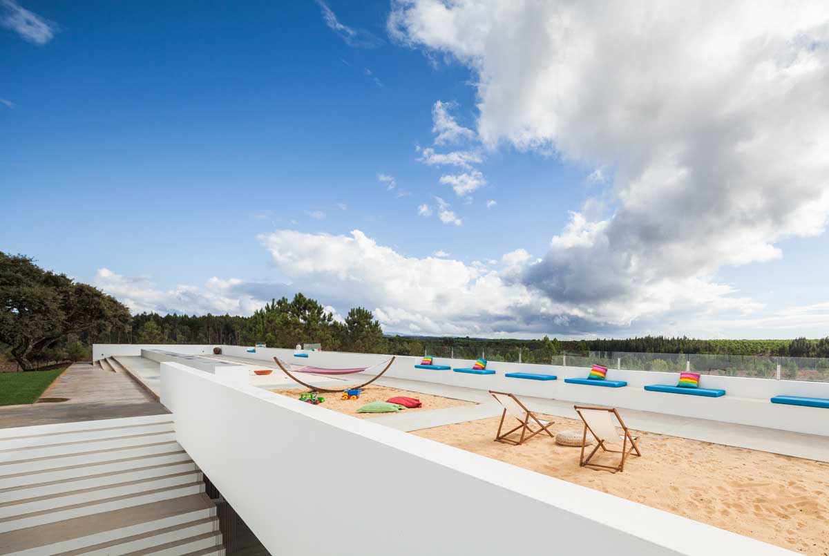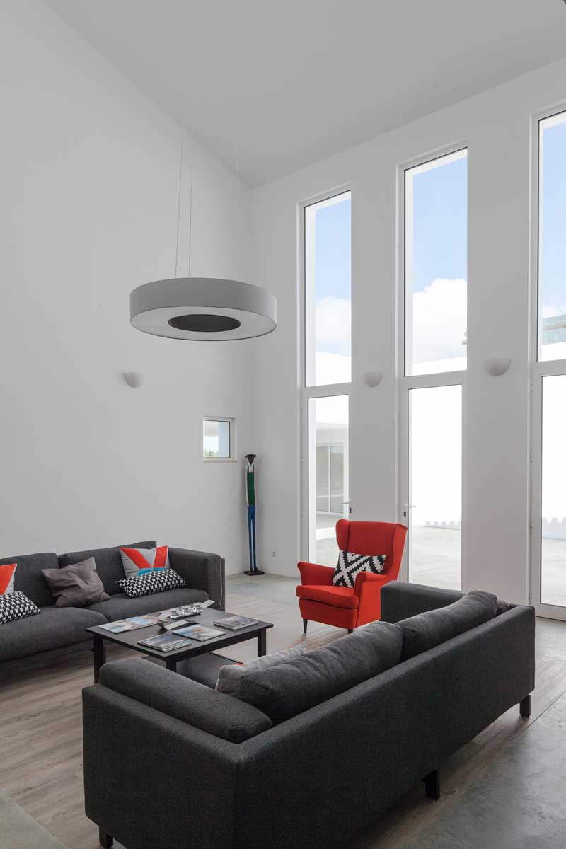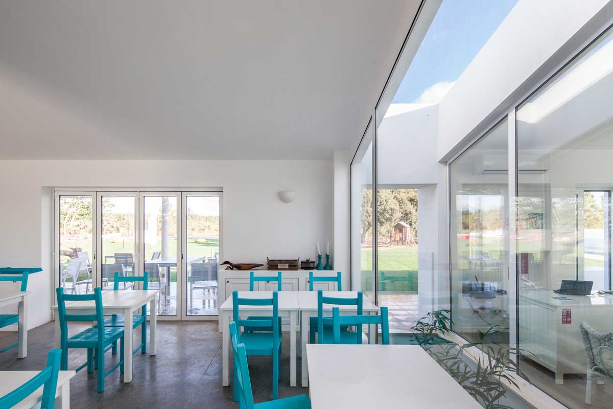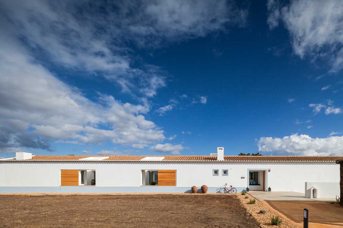 The XXS house is a small caretaker’s house of a rural tourism, Pe no Monte in Odemira. This square house with 8.40×8.40m marks the path of access through two blind and white walls that lead us to the entrance area of the tourist complex. The contact with the outside is done only by two shaded entry courtyards that ensure good visibility to the owners’ house entrance, vegetable garden and parking.