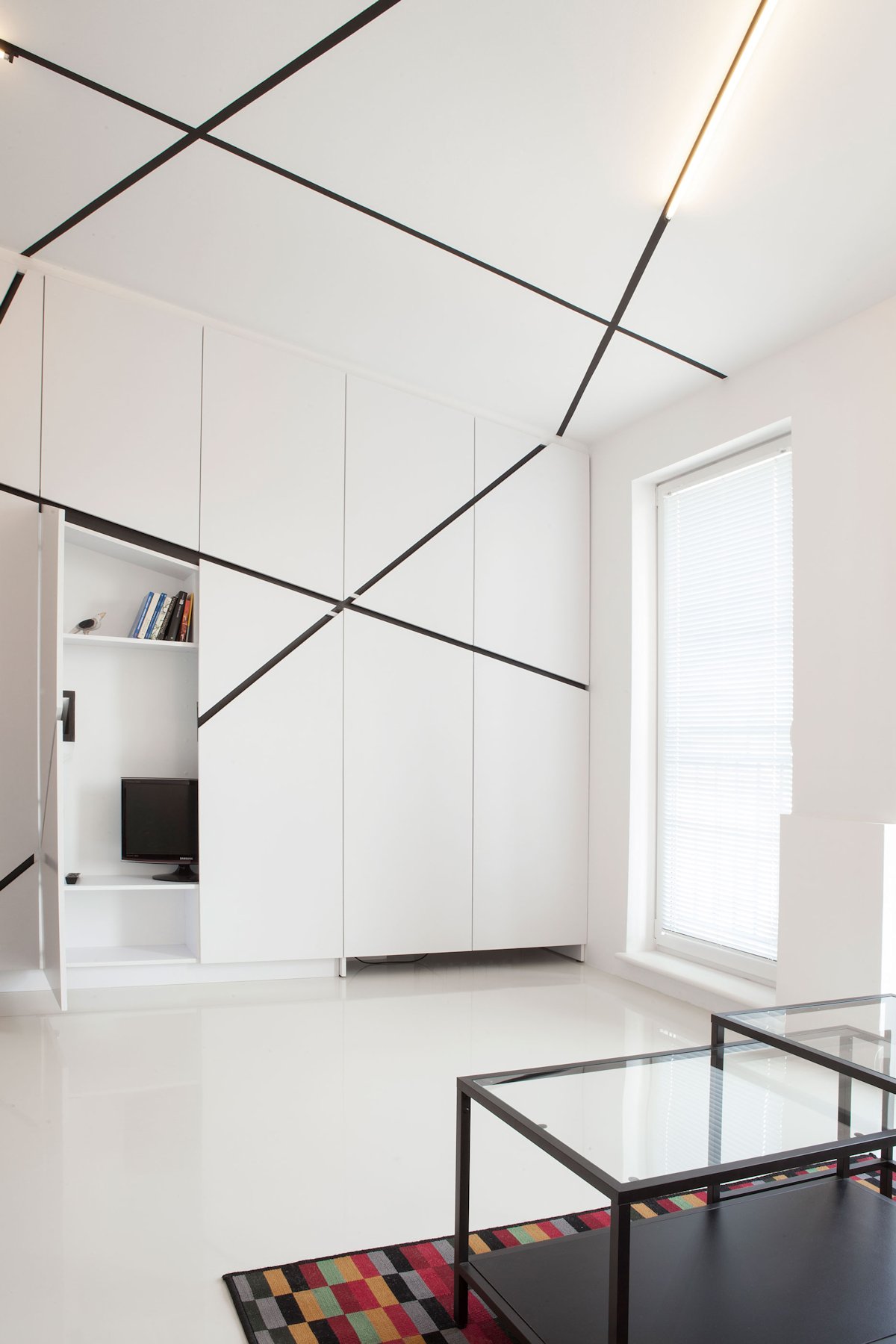 Modest budget and Peters love for minimalism brought us to this design solutions. Desk, TV, storage space and kitchen are hidden within the white front panels.