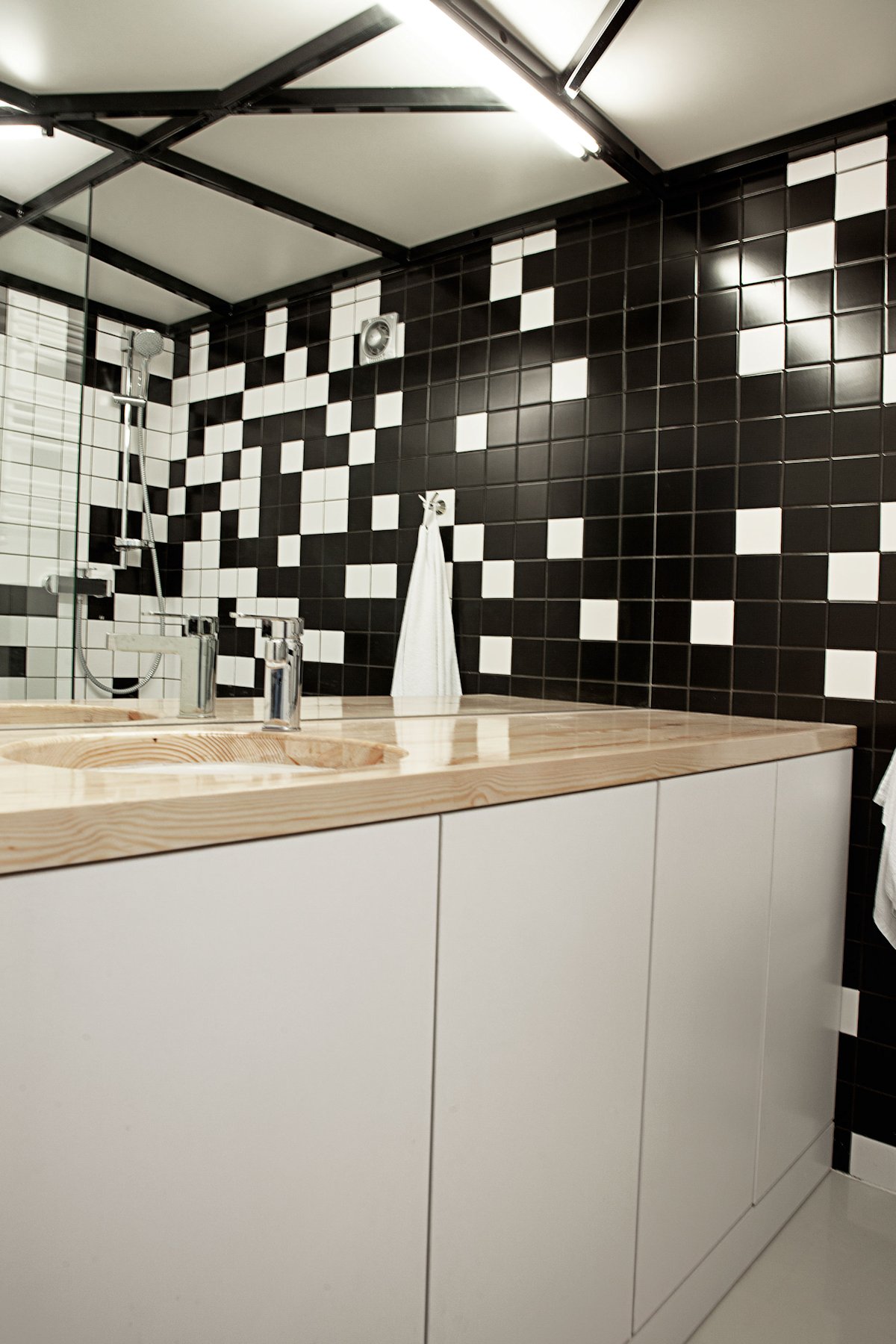 Materials: resin (floor), white melamine plate (fittings), black plate melamine (fittings handles), profiled steel powder coated (ladder, construction of the mezzanine floor, table leg), pine wood (bathroom top), black and white tiles (bathroom, kitchen).