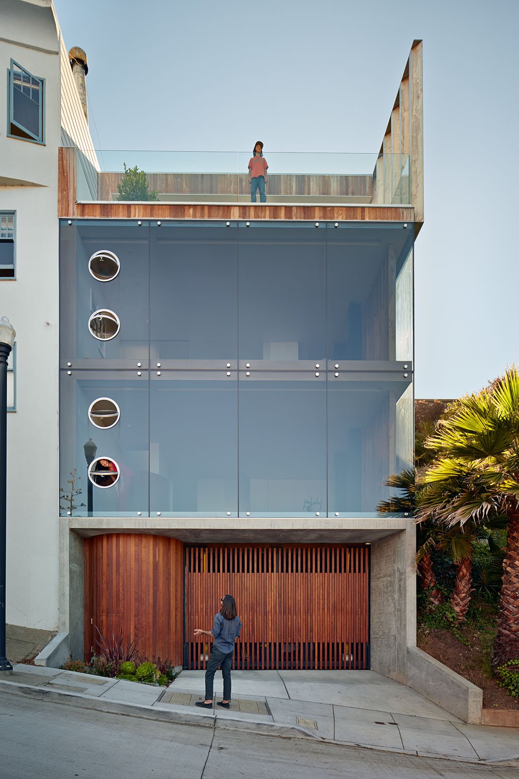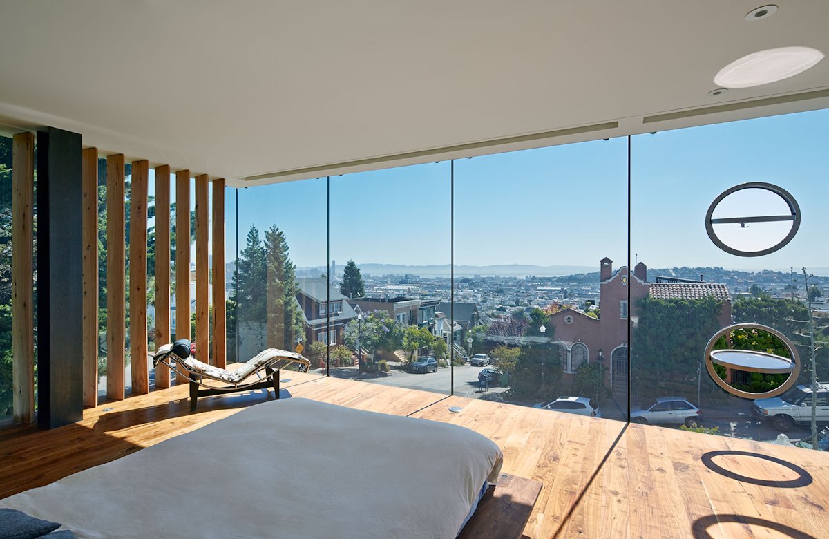 Beyond the structural challenges, the biggest issue in designing Peter’s house was opening the building to the expansive view while maintaining a level of privacy from the sidewalk and garden that pass alongside. Around the time the house was being designed, the new on-ramp to the Golden Gate Bridge was under construction which necessitated clearing a grove of Monterey Cypress trees in it’s path from the Presidio. We secured some of these trees and working with a local milling shop turned them into 90 solid wood louvers (fixed on the exterior/operable on the interior) that regulate openness and privacy.