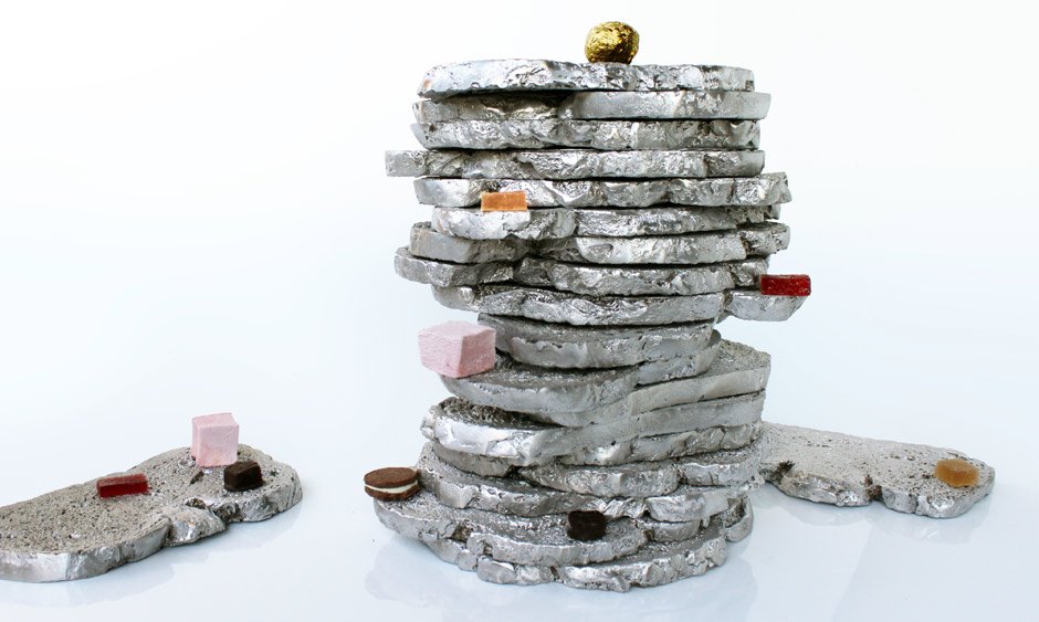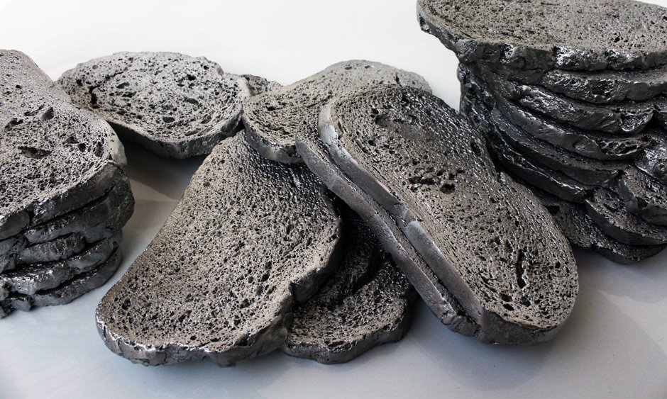 Made of aluminium, each plate is different and unique, as real loaves of bread were used as models, and when put together, they form a whole bread.