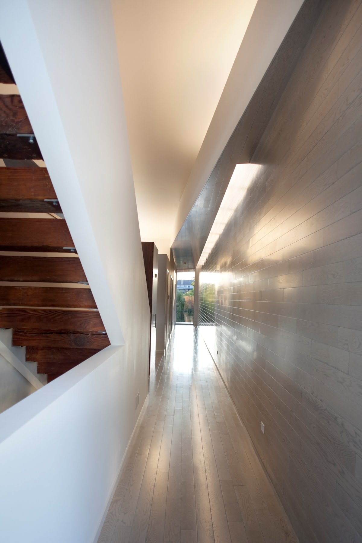 The Postcard House is a conventional wood frame construction. Exterior materials consist of prefinished metal panels, and stained cedar siding. The building envelope features spray-foam insulation and thermally improved glazing for superior energy efficiency. High-efficiency forced-air systems heat and cool the house.